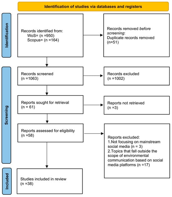At the eligibility stage, all 58 articles were assessed in full text against the predefined inclusion and exclusion criteria. Studies were excluded if they focused on non-mainstream platforms such as Ant Forest, or addressed themes outside the scope of social media–based environmental communication (e.g., financial technologies, consumer marketing, air pollution psychology, or non-Chinese contexts). In total, 23 articles were excluded for these reasons. The final dataset therefore comprised 38 empirical studies, which were included in the systematic review and subsequent synthesis (see Figure 1). The PRISMA 2020 list can be found in Table S1.