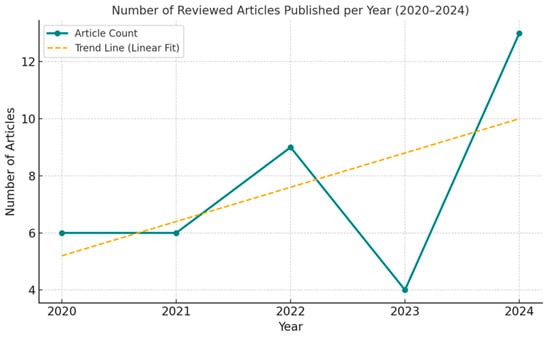 Yearly distribution of reviewed articles with linear trend line (2020–2024).