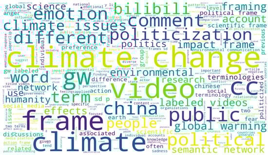 To complement the topic modeling results, a word cloud was generated using the titles, abstracts, and keywords of the 38 reviewed articles (see Figure 5). This visualization highlights dominant lexical themes such as “climate change”, “video”, “emotion”, and “frame”, which align closely with the topic clusters identified via LDA. It also underscores the increasing prominence of video platforms such as Bilibili and TikTok in the discourse on environmental communication in China.