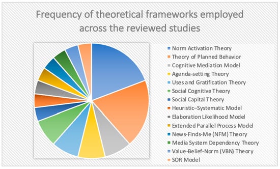 The theoretical frameworks and models used in the reviewed articles were identified and classified; details are reported in Table 3. More than half of the studies (54%) explicitly employed a theoretical framework or model. As shown in Figure 6, the most frequently used theories were the Theory of Planned Behavior (TPB) and Norm Activation Theory (NAT), both commonly applied to explain pro-environmental behaviors such as waste sorting and low-carbon practices. Other recurrent frameworks included Social Cognitive Theory, Uses and Gratifications Theory (UGT), and Agenda-Setting Theory, typically used to examine how social media facilitates the dissemination of environmental protection information and user engagement. The Cognitive Mediation Model (CMM) was also employed to explain how media attention and information processing shape knowledge acquisition, risk perception, and policy support regarding environmental issues. Additionally, theories grounded in emotion and cognition, such as the stimulus–organism–response (SOR) model, the heuristic-systematic model (HSM), and the elaboration likelihood model (ELM), were employed to analyze information framing design and its persuasive effects.