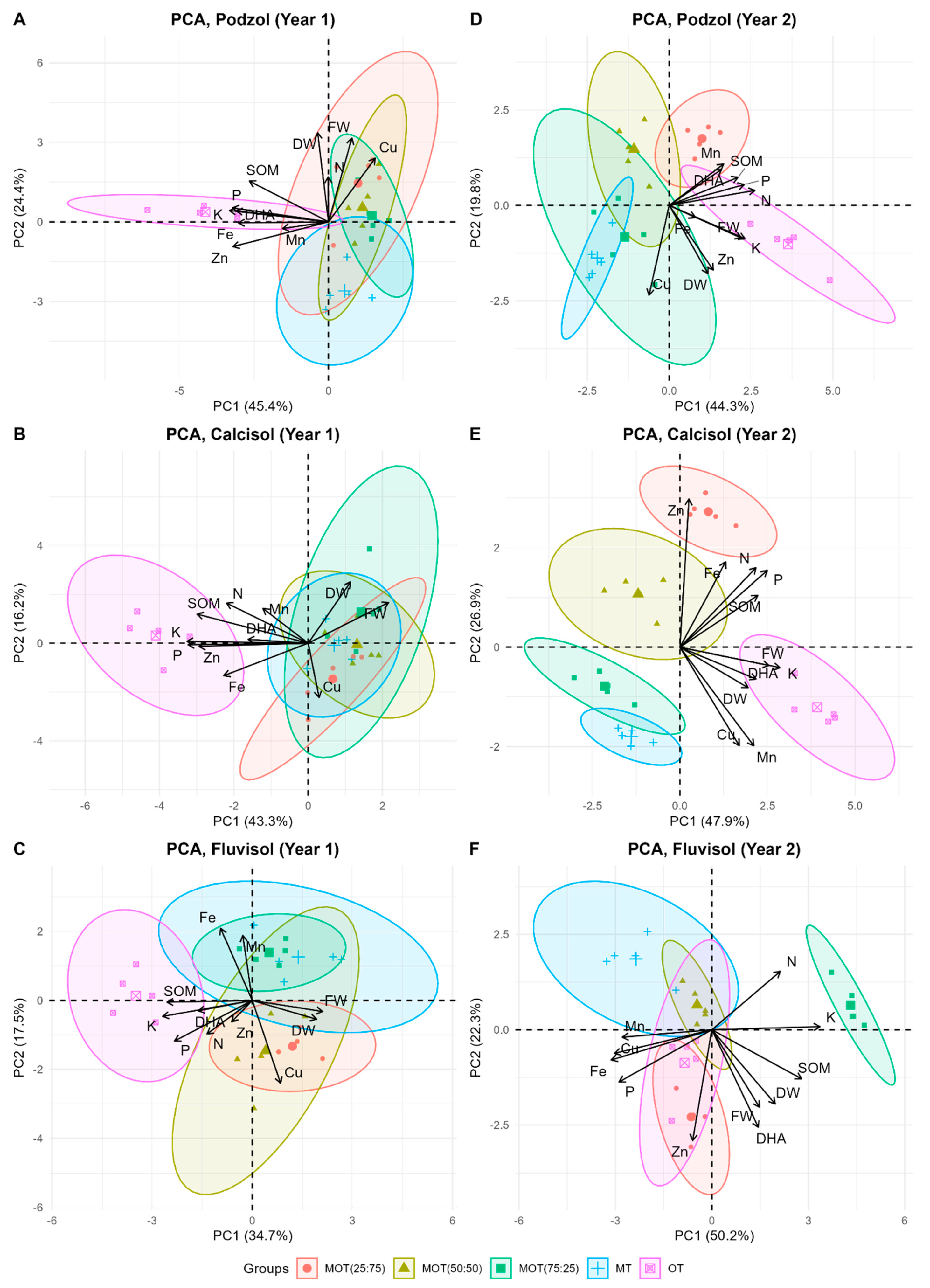 - In the fluvisol, as for the calcisol, there were no significant differences for fresh weight production. However, dry mass production was consistently higher in the mixed and exclusively organic treatments, although only the MOT(75:25) treatment was significantly higher than the exclusively chemical treatment, in contrast to what was registered in the first year of the trial.