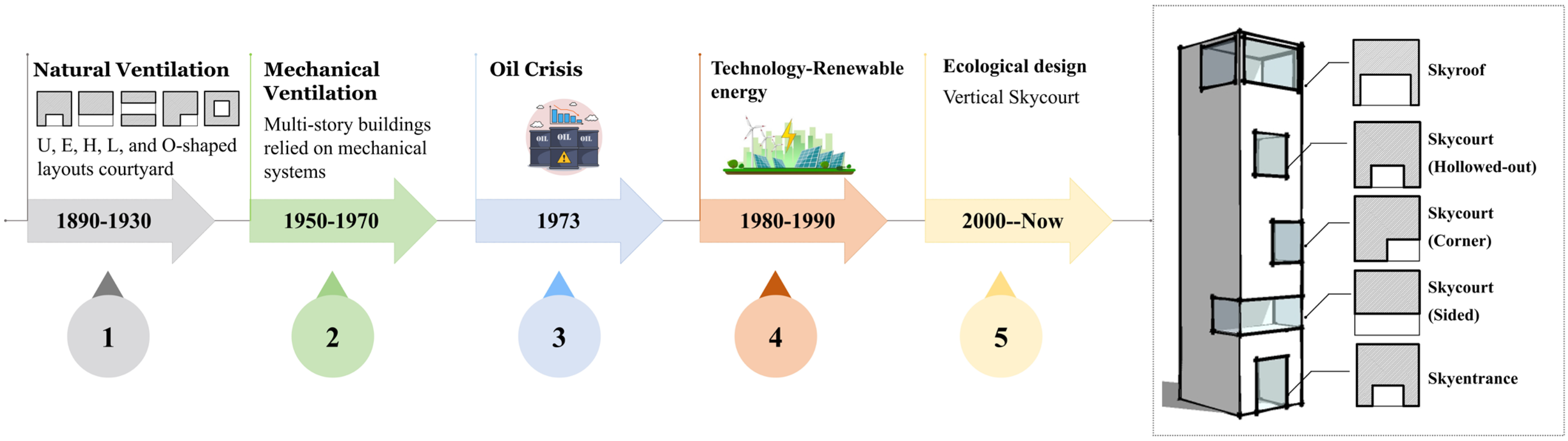 - The results of the simulation process demonstrated the effect of skycourt spaces, especially the hollowed-out skycourt, in reducing air temperature by up to 3 °C during the hottest summers and reducing energy consumption by rates ranging between 8 and 10% annually in most alternative prototypes and reducing carbon emissions by ratios of up to 10% annually.