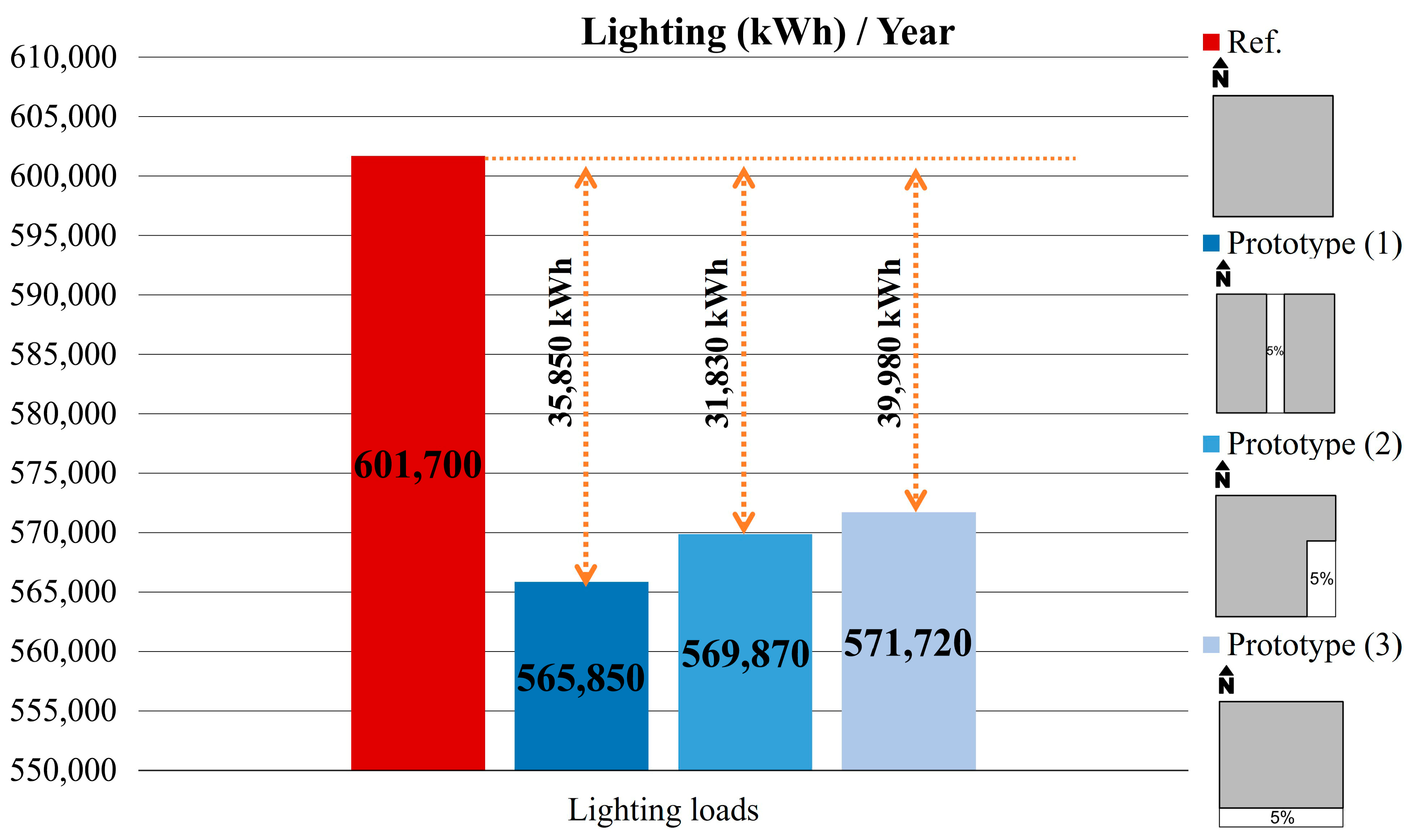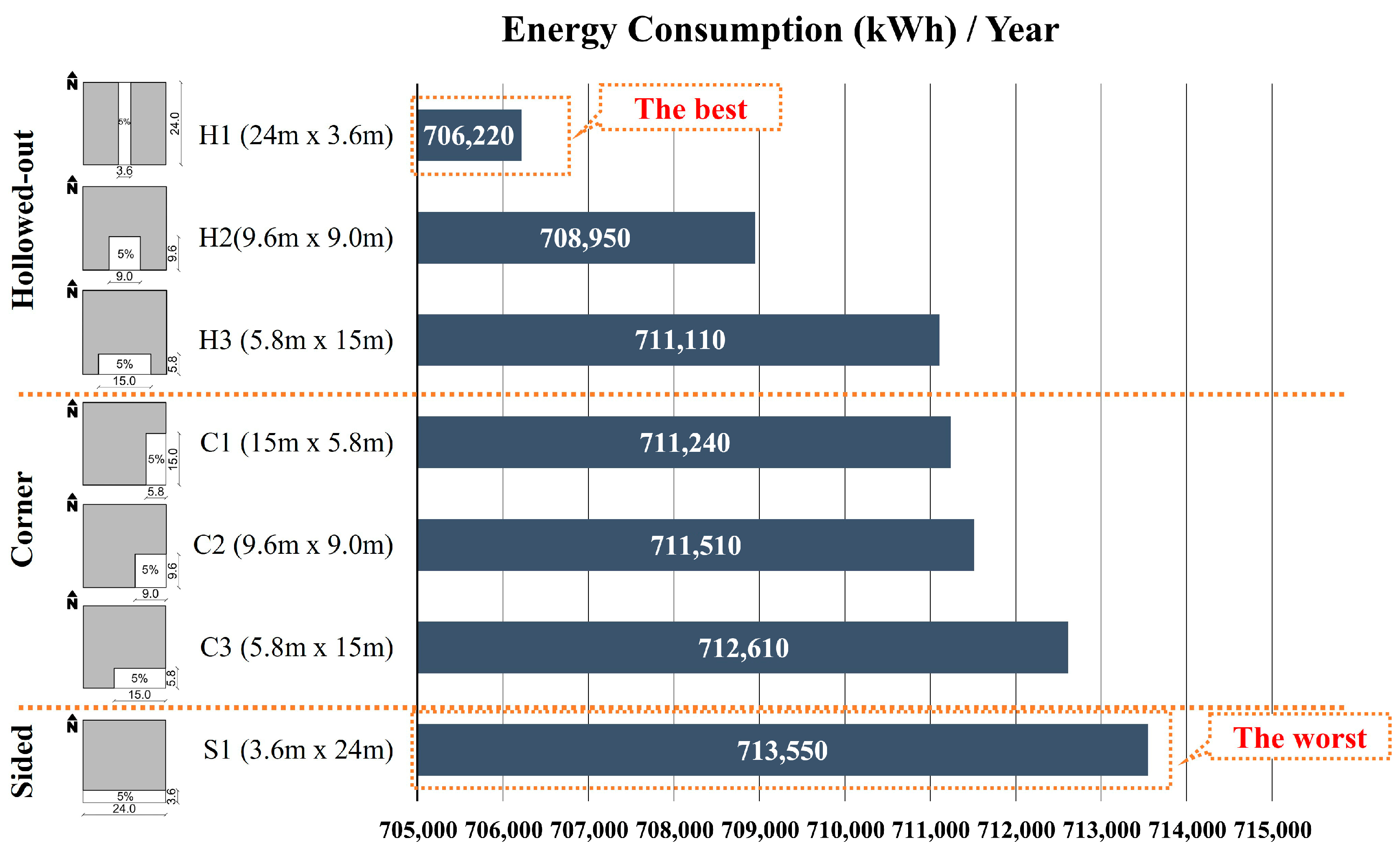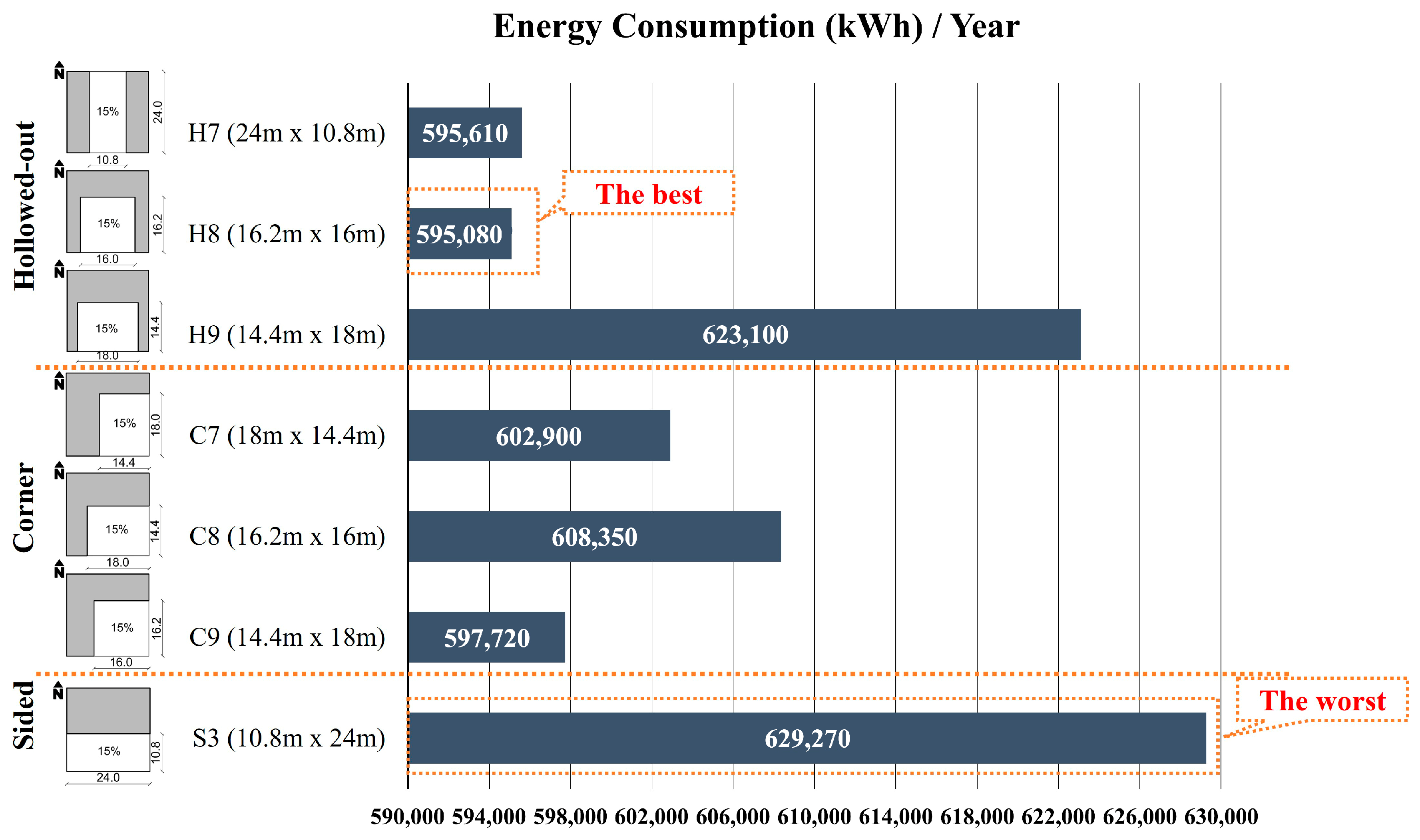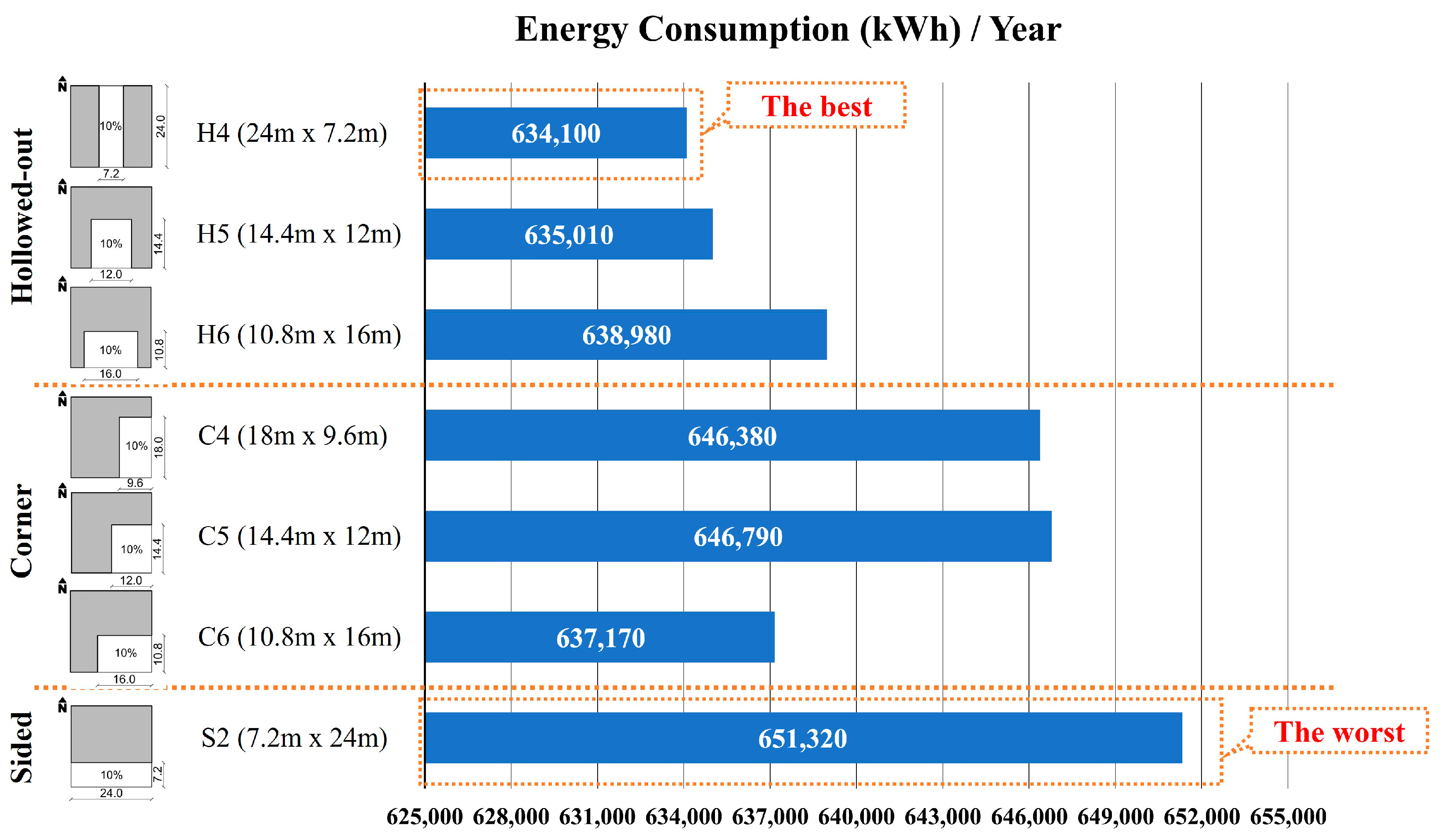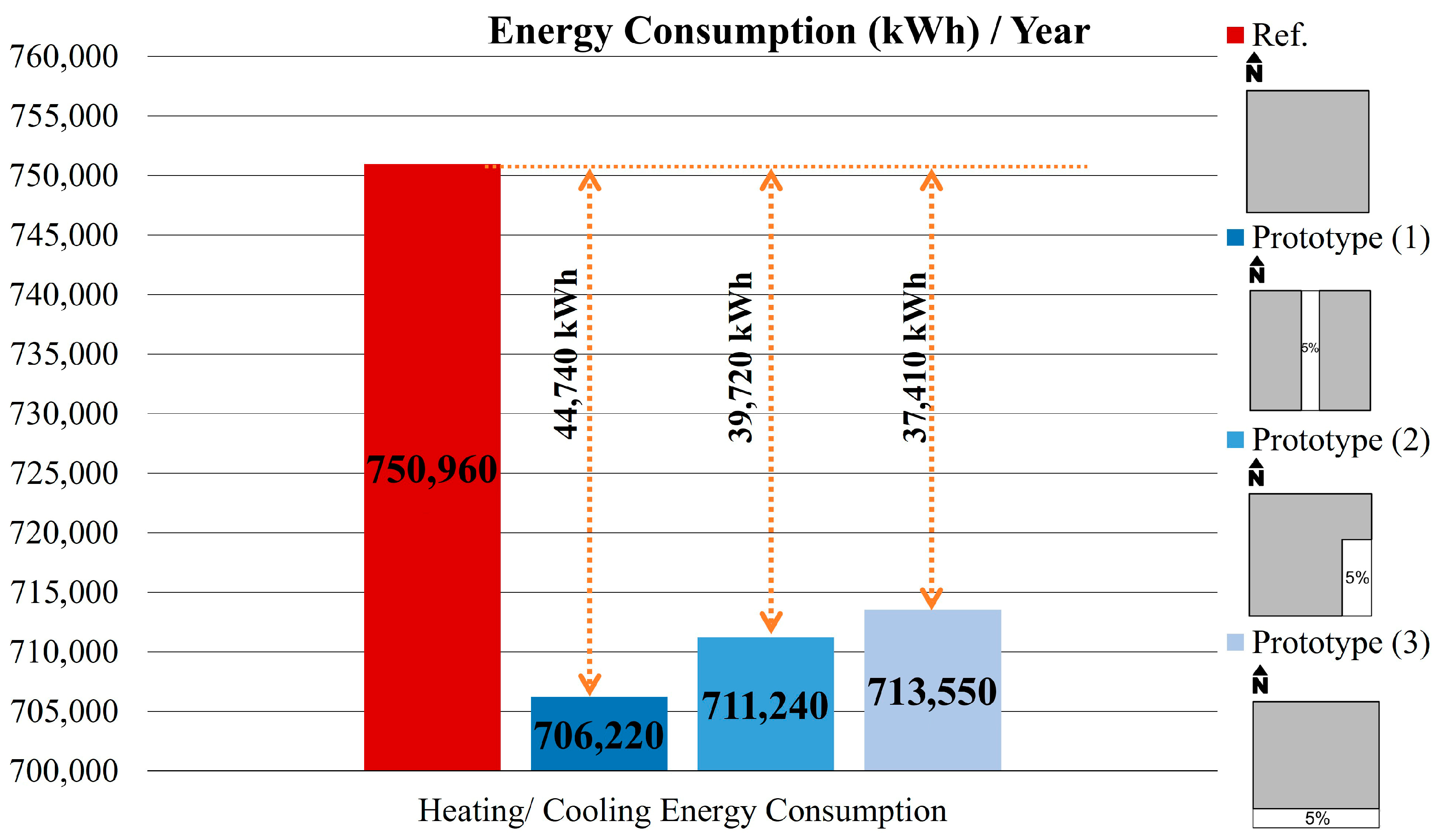 - Optimizing morphological indicators of skycourt usage, like EAR and FAR, indicated that the prototype of the hollowed-out skycourt also retained the best performance in most of the alternatives, followed by the second alternative in the hollowed-out skycourt. Also, the sided skycourt cannot be considered the best alternative in most cases, owing to the resulting high energy consumption. These results indicate a direct relationship between both indicators, EAR and FAR, and the increased environmental performance of the skycourt.