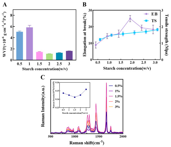 The influence of different concentrations of starch on the physical properties of composite films. (A) The effect of starch concentration on composite film WVP. (B) The effect of starch concentration on composite film EB and TS. (C) Raman spectra of oil samples covered with composite films of different starch concentrations and the corresponding ratio of I(970)/I(1438).