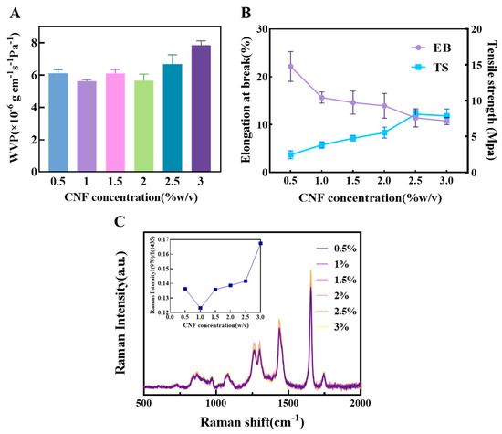 As shown in Figure 3A, the WVP reached its minimum value at a CNF content of 1%. This indicates that at this concentration, CNF can disperse uniformly in the matrix and form a continuous, dense nanofiber network, effectively extending the diffusion path of water molecules and improving barrier performance. When the content was increased to 1.5%, the WVP unexpectedly increased. This may be due to localized agglomeration of CNF beyond a critical concentration, creating interfacial defects and micro-channels that provide additional pathways for water vapor permeation. At 2% content, the WVP slightly decreased, suggesting a structural rearrangement where some areas reformed an effective barrier. However, as the content further increased to 2.5%, the WVP rose again, indicating that at high concentrations, CNF is difficult to disperse uniformly. The increased number of agglomerates leads to structural heterogeneity and reduced interfacial compatibility, thereby weakening its water barrier capacity.