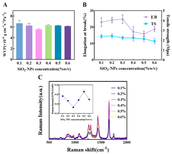 As shown in Figure 4A, the WVP reached its minimum value at a SiO2-NPs content of 0.3%. This indicates that at this concentration, the nanoparticles can disperse uniformly within the matrix, creating an effective tortuous path that significantly hinders the diffusion of water molecules. When the content was increased to 0.4%, the WVP increased, likely due to nanoparticle agglomeration beyond a critical concentration. This creates interfacial voids and defects, forming rapid channels for water vapor migration. Although the WVP decreased thereafter, the change was not significant, suggesting that the structure of the agglomerates stabilized but could not restore the highly effective barrier network formed at initial uniform dispersion.