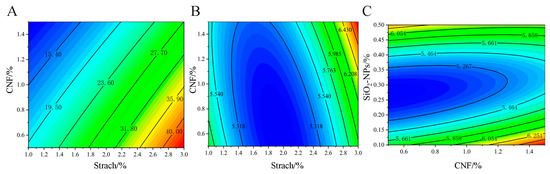 The interaction effects of different concentrations of starch, CNF, and SiO2-NPs on the physical properties (TS, EB, WVP) of the film are shown in the contour plots (Figure 5). According to the data in Table 1, the interaction AB had a significant effect on EB, while interactions AB and BC had significant effects on WVP. These interactions are discussed below.