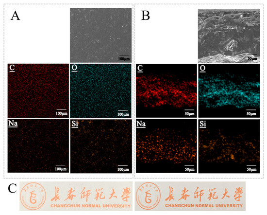The average thickness of the films was 0.087 ± 0.014 mm. The film surfaces were continuous, dense, and free of visible defects (Figure 6A,C), indicating good compatibility among starch, CNF, and SiO2-NPs and the absence of phase separation. EDX mapping (Figure 6A) showed a homogeneous distribution of C, corresponding to the continuous organic network formed by starch and CNF. Na was uniformly distributed, confirming that TEMPO-CNF was evenly dispersed within the film. Si was also uniformly distributed, suggesting that SiO2-NPs were well dispersed without noticeable aggregation, which is beneficial for enhancing the mechanical and barrier properties of the films. Cross-sectional SEM images (Figure 6B) revealed a uniform, dense, layered structure without pores, cracks, or delamination, demonstrating the formation of an integral three-dimensional network. Cross-sectional EDX mapping showed that C, O, Na, and Si were evenly distributed throughout the thickness of the films, further confirming the homogeneous dispersion of all components and the structural uniformity of the composite films.