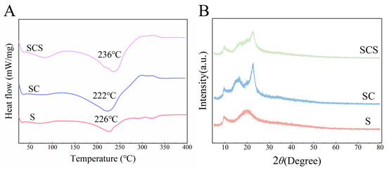 Thermal properties and crystalline structure characterization of the films. (A) DSC curves of the starch film (S), starch/CNF film (SC), and starch/CNF/SiO2 composite film (SCS). (B) XRD patterns of S, SC, and SCS films were used to analyze the influence of different functional components on the crystalline structure of the films.