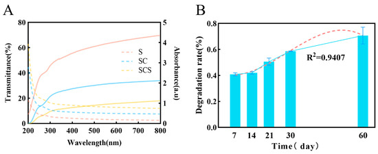 (A) Optical properties of composite films. The solid line represents the transmittance (left Y-axis). The dashed line represents absorbance (right Y-axis). (B) Biodegradation kinetics of the composite film in soil, with the red dashed line showing the curve fitted to the 60-day data to project the long-term degradation trend.