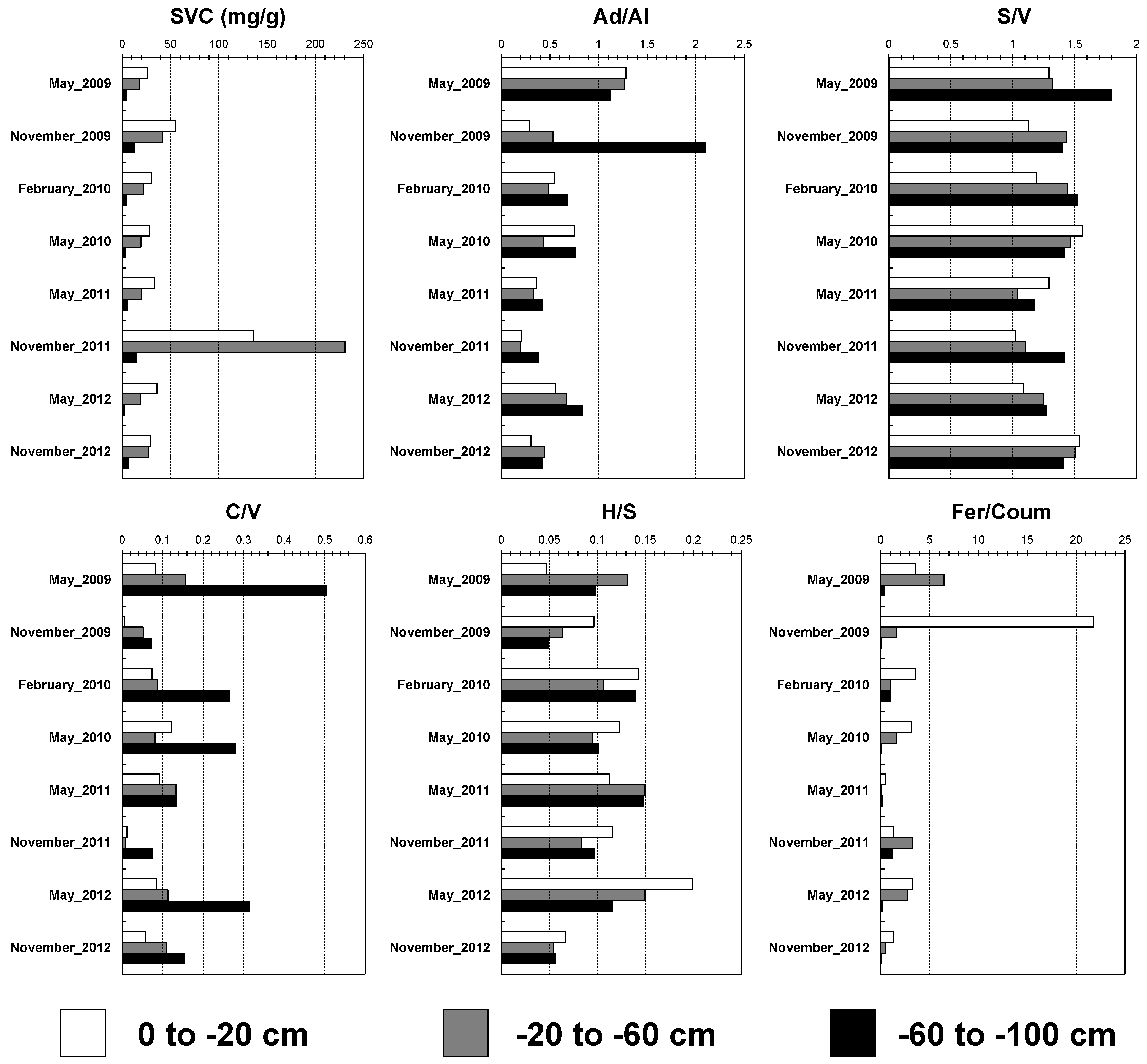 Figure 3). In the surface layer (0 to −20 cm), SVC values increased under cultivation, reaching a maximum in November 2011 during the rest period. This increase reflects improved stabilization and microbial treatment of lignin under low disturbance and changing soil conditions [