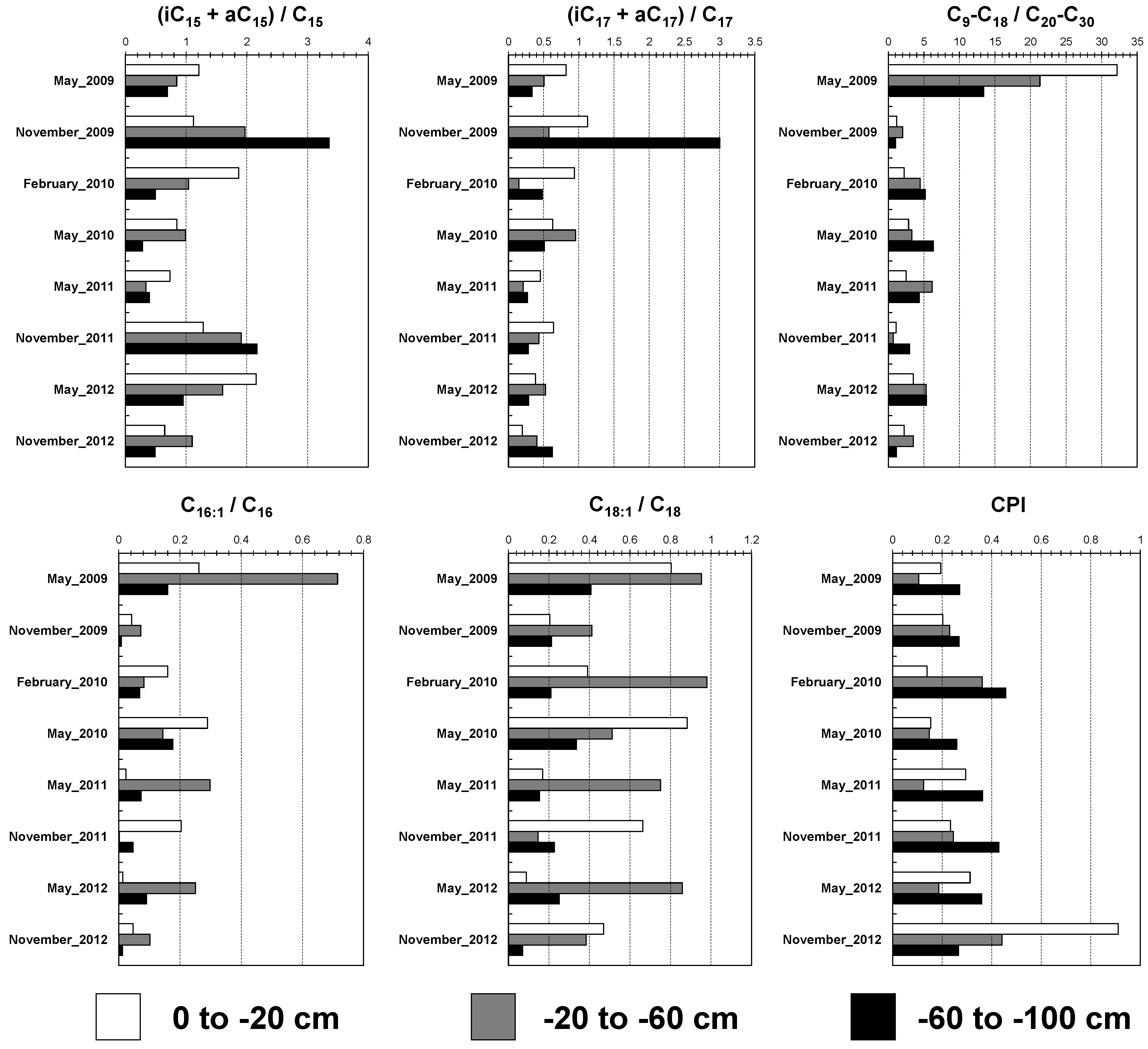At the deepest layer (−60 to −100 cm), lipid biomarkers indicate low microbial activity and a predominance of stabilized OM. This is reflected in the consistently low C9-C18/C20-C30 ratios (November 2012: 1.21;