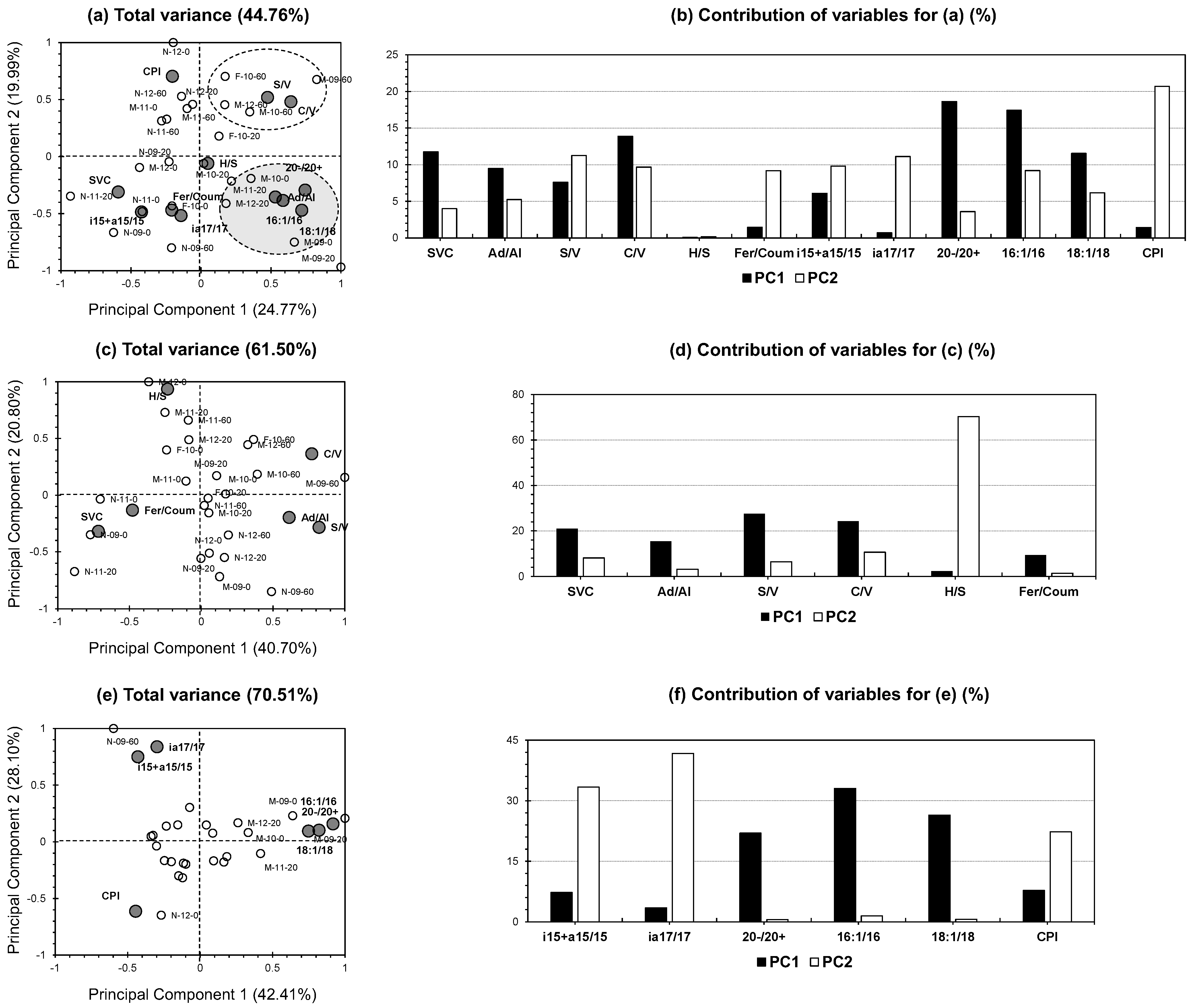 Figure 5b displays the contributions of the studied variables to the first two PCs. For PC1, the largest contributors were C9-C18/C20-C30 and C16:1/C16 (18.62% and 17.42%, respectively;