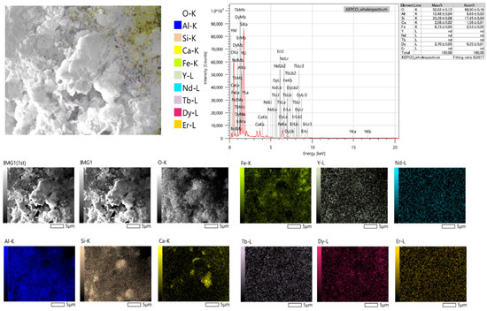Investigating the SEM-EDS elemental map of the CFA (Figure 3), Al and Si concentrations are high. This is also a confirmation of the dominant presence of aluminosilicates in CFA. Additionally, most Fe does not coincide with oxygen. This could mean that a high concentration of Fe mineral is not in the form of Fe oxides. As for the distribution of REEs in the CFA, REE-bearing particles are found throughout the matrix. Critical REEs are evenly distributed throughout the Al-Si-Mg-Ca-rich aluminosilicates, except for Dy which seemed to be closely associated with the Fe-rich particles, concurring with previous findings [18,23].