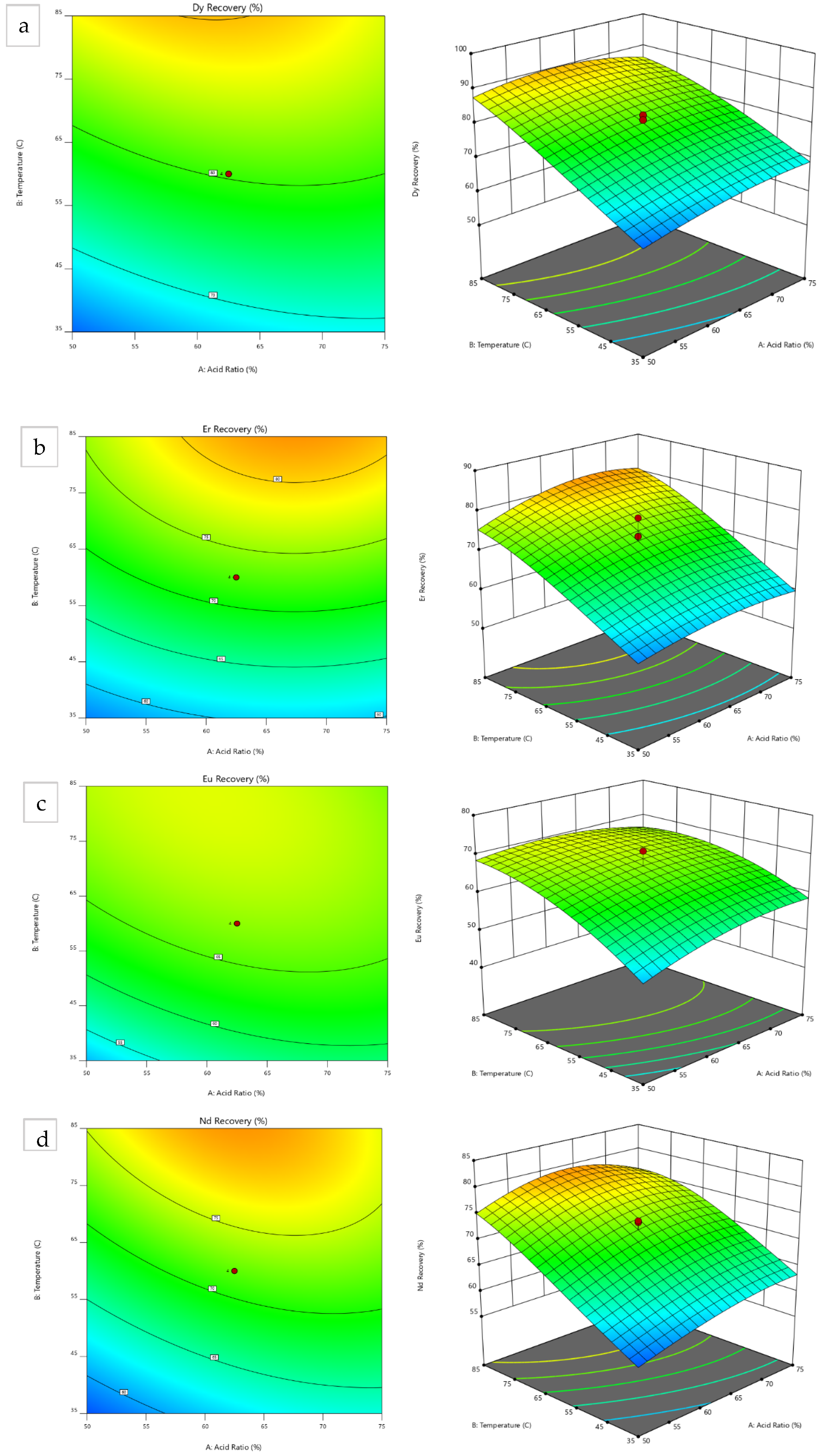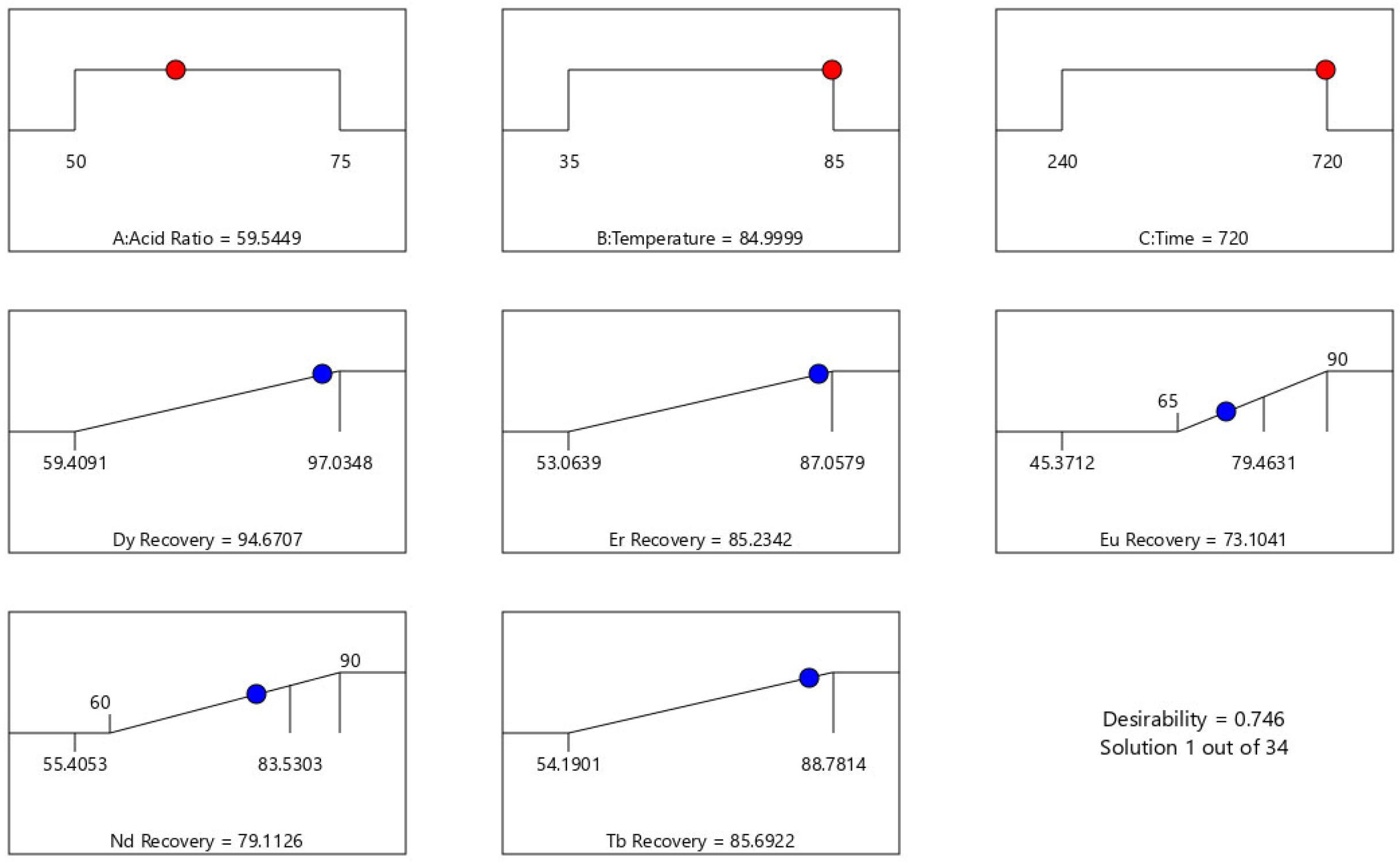 Leaching optimization was performed using RSM-CCD, suggesting a quadratic model to predict the recovery of critical REEs. The model’s accuracy was statistically validated, achieving accuracy rates of 95.6% for Dy, 97.8% for Er, 97.3% for Eu, 99.1% for Nd, and 99.2% for Tb. The optimum leaching conditions (