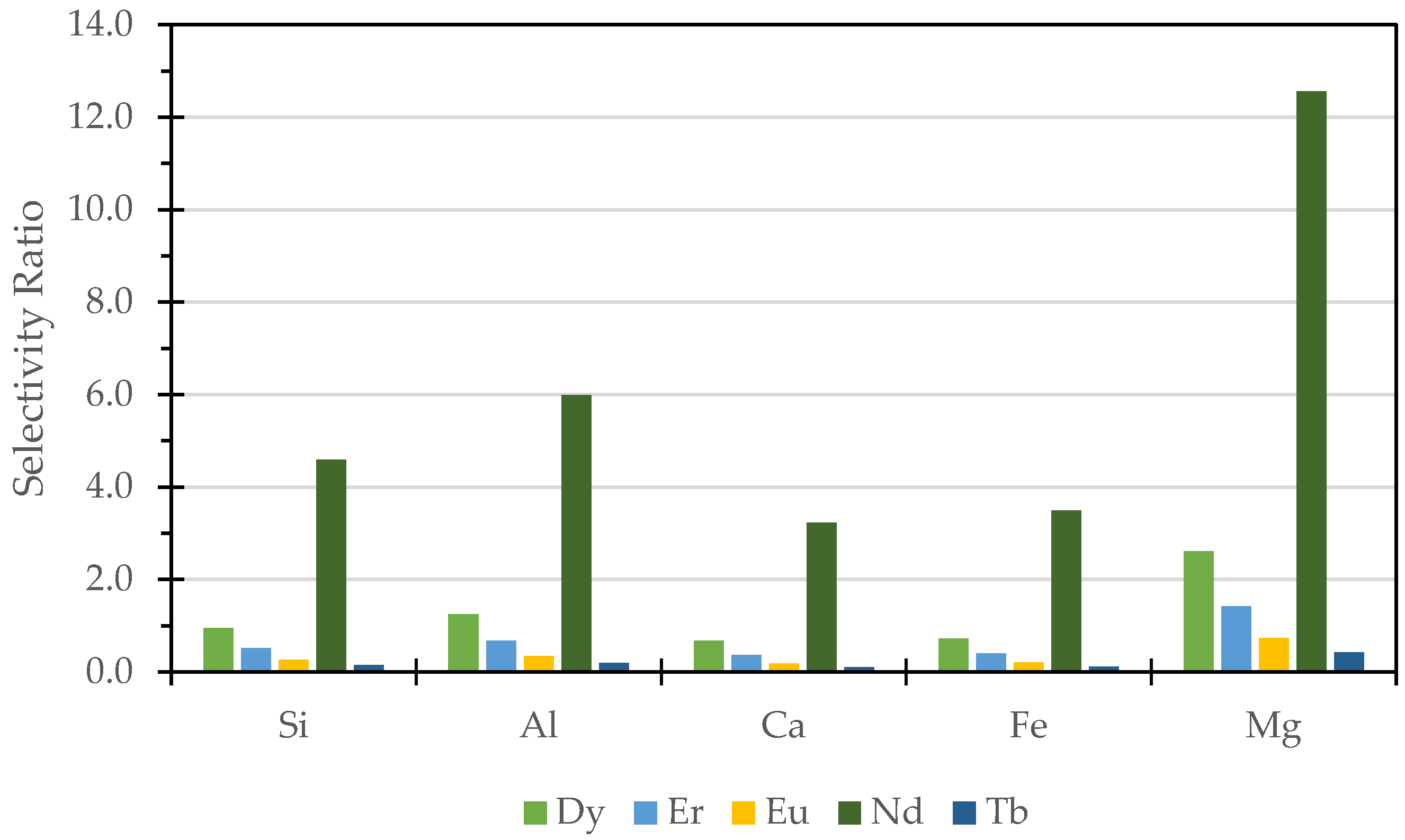 −1), favoring spontaneous dissolution. This aligns with the selectivity ratio results, where the majority of Ca ions in the leachate originate from anorthite and calcite, leading to a lower selectivity ratio. Conversely, Mg ions primarily come from ankerite and illite, leading to a higher selectivity ratio. As a result, the order of major element selectivity, in relation to REE concentration, was revised to Mg > Fe ≥ Al > Si > Ca.