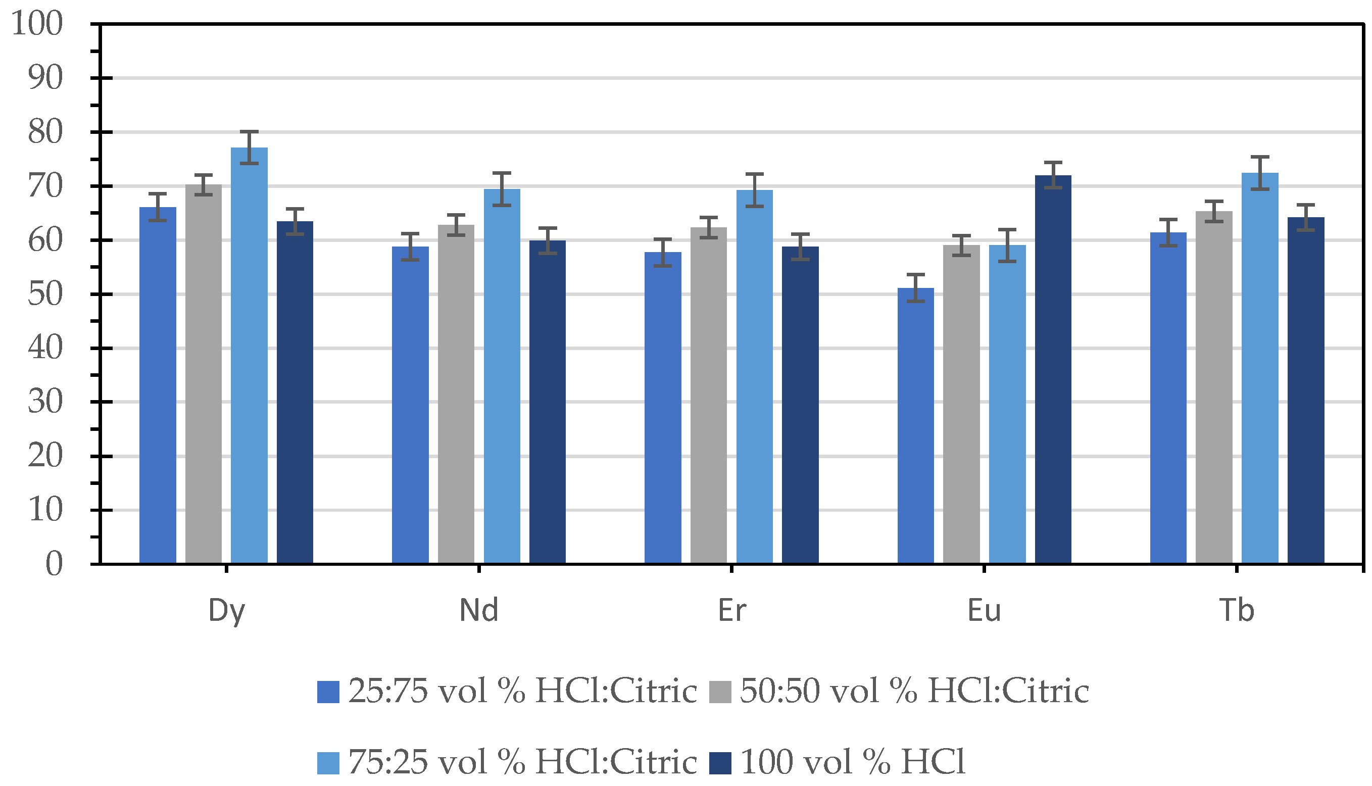 26]. Hydrochloric acid (HCl) has been identified as an effective lixiviant, consistently yielding high REE extraction rates. However, the use of HCl presents challenges due to its highly corrosive nature and relatively high cost compared to other acids [