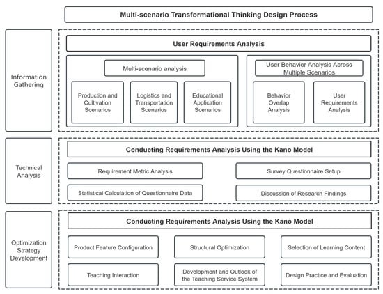This study, grounded in multi-scenario design thinking, employs the Kano model for quantitative assessment during the user requirement consolidation phase. Organically integrating qualitative and quantitative design methodologies provides robust theoretical and data-driven support for optimizing the design of plant growth cycle teaching aids. The design process under multi-scenario transformation thinking can be divided into three phases: pre-information collection, mid-term technical analysis, and post-optimization strategy construction (Figure 2). In the pre-information collection stage, first, sort out the teaching aids product multi-use scenarios, and collect and sort out multi-scene user behavior, identifying clear user behavior overlap points. In the mid-term technical analysis stage, the Kano model is used to calculate the weights of user requirements and to clarify their priorities in the product design process. Finally, based on the calculation results, we summarize and develop an optimization strategy for the plant growth cycle science teaching aids.