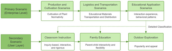 At the primary scenario level, the guiding objective of user behavior centers on standardizing teaching aids and ensuring their effective distribution to learning environments. During this phase, scientific management systems and technical measures guarantee the stability and controllability of plant growth conditions. Standardization of the growth process represents a key advantage of regulated cultivation. By establishing and implementing unified cultivation procedures and quality standards, consistency is ensured across each batch of plants during their development. This minimizes disruptions to teaching caused by individual differences, enabling students to more accurately grasp universal patterns when observing, recording, and analyzing plant growth. Consequently, learning precision and effectiveness are enhanced. Through this integrated approach, the primary scenario not only establishes a foundation for subsequent educational activities but also demonstrates the unique strengths of school–enterprise collaboration. It constructs an efficient, practical teaching service system that deepens children’s understanding of plant growth cycles, potentially pioneering new pathways at the intersection of educational innovation and technological application.