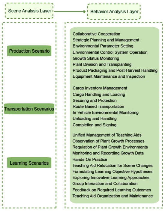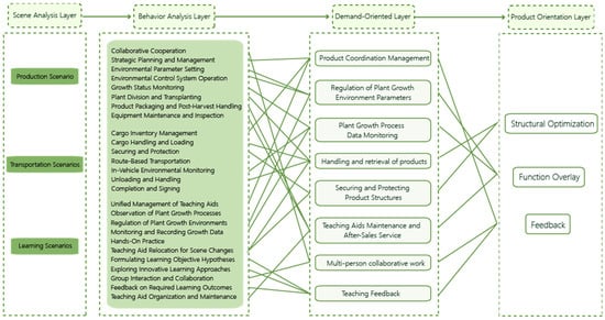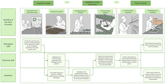 The plant growth cycle can be divided into seedling, sub-adult and mature stages. This research uses this time frame to define the workflow and operational flow of the intelligent plant cultivation base. In each growth stage, the core of the base is to provide the best environment for plants. In terms of workflow, the users of the plant cultivation base can be divided into three categories: managers coordinate the planning and formulate planting plans; technicians operate and maintain the cultivation system to accurately control and optimize the environment; operators are the frontline production executives who undertake daily cultivation work such as sowing, transplanting, packaging, and so on, and although some of the work is reduced with the enhancement of automation, some parts still require manual intervention. The interaction between the staff and the product mainly includes controlling environmental parameters, system operation, plant division, planting, handling, packaging, and equipment maintenance and repair (Figure 5).