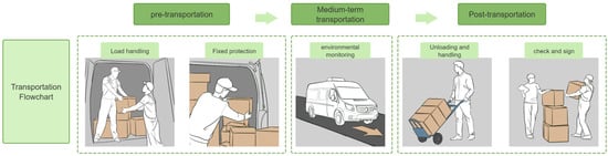 The second scenario is logistics and transportation. In the process of converting teaching aids from the production and cultivation scenario to the learning and application scenario, the transportation scenario not only connects the two ends of production and consumption but also influences the status and quality of the products that finally reach learners. In this transportation scenario (Figure 6), the core task of the transportation operator is to load and unload goods, transport them, and monitor the journey. According to the above analysis, the interactions between the transportation operator and the product are mainly as follows: loading and handling, fixing and protecting, environmental monitoring, unloading and handling, and delivery and signing.
