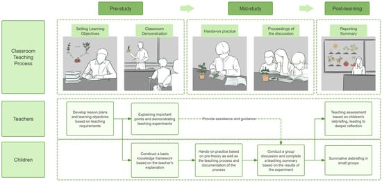 The last is the learning application scenario. The learning scenarios of teaching aids can be divided into entirely open-ended scenarios and semi-open-ended scenarios. Semi-open-ended scenarios primarily involve classroom and family teaching, in which teachers or parents lead learning activities through lectures or experiments. The full-open scenario is characterized by treating children as the main body of learning, encouraging them to engage in independent, exploratory learning, primarily through outdoor exploration. The learning process in teaching application scenarios shows some commonality, mainly reflected in three phases: setting goals in the early stage, practicing and discussing in the middle stage, and reporting and summarizing in the late stage (Figure 7). In this process, children’s main interactive behaviors include daily plant maintenance, careful observation and recording of growth conditions, active participation in hands-on activities, and discussion and sharing with peers.