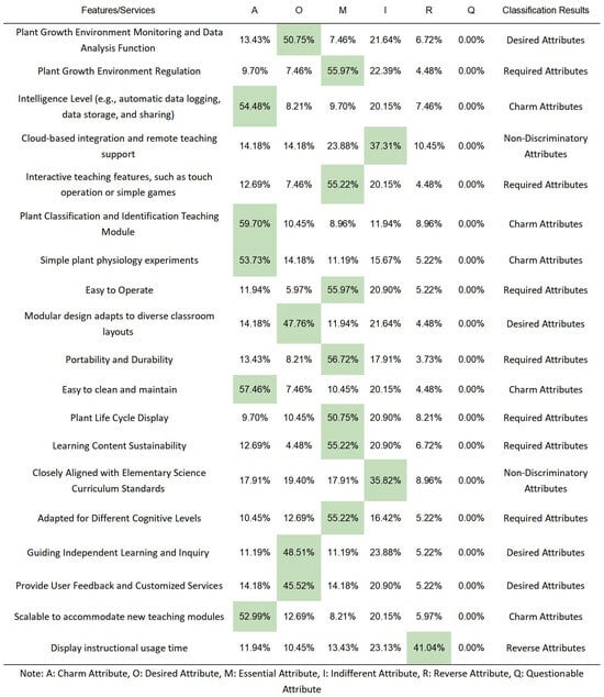 Desired attributes—such as plant growth environment monitoring and data analysis, modular structure, guidance for independent learning and exploration, and provision of user feedback and customized services—exhibit notably high “Better” and “Worse” values. This indicates that refining these features directly impacts overall user satisfaction. Therefore, product development must prioritize its implementation and optimization.