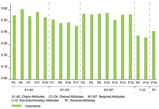 Based on the Better–Worse coefficient analysis method, the calculated coefficients for each requirement were plotted in a sensitivity matrix with satisfaction coefficients on the horizontal axis and dissatisfaction coefficients on the vertical axis. Based on the statistical results in the table, a satisfaction matrix for the 19 demand indicators was plotted, with the satisfaction coefficient on the X-axis and the dissatisfaction coefficient on the Y-axis (all data normalized to absolute values). The centerline of the X-axis represents the average satisfaction coefficient, while the centerline of the Y-axis represents the average dissatisfaction coefficient (Table 4). This configuration highlights the varying weights of each data point [26].