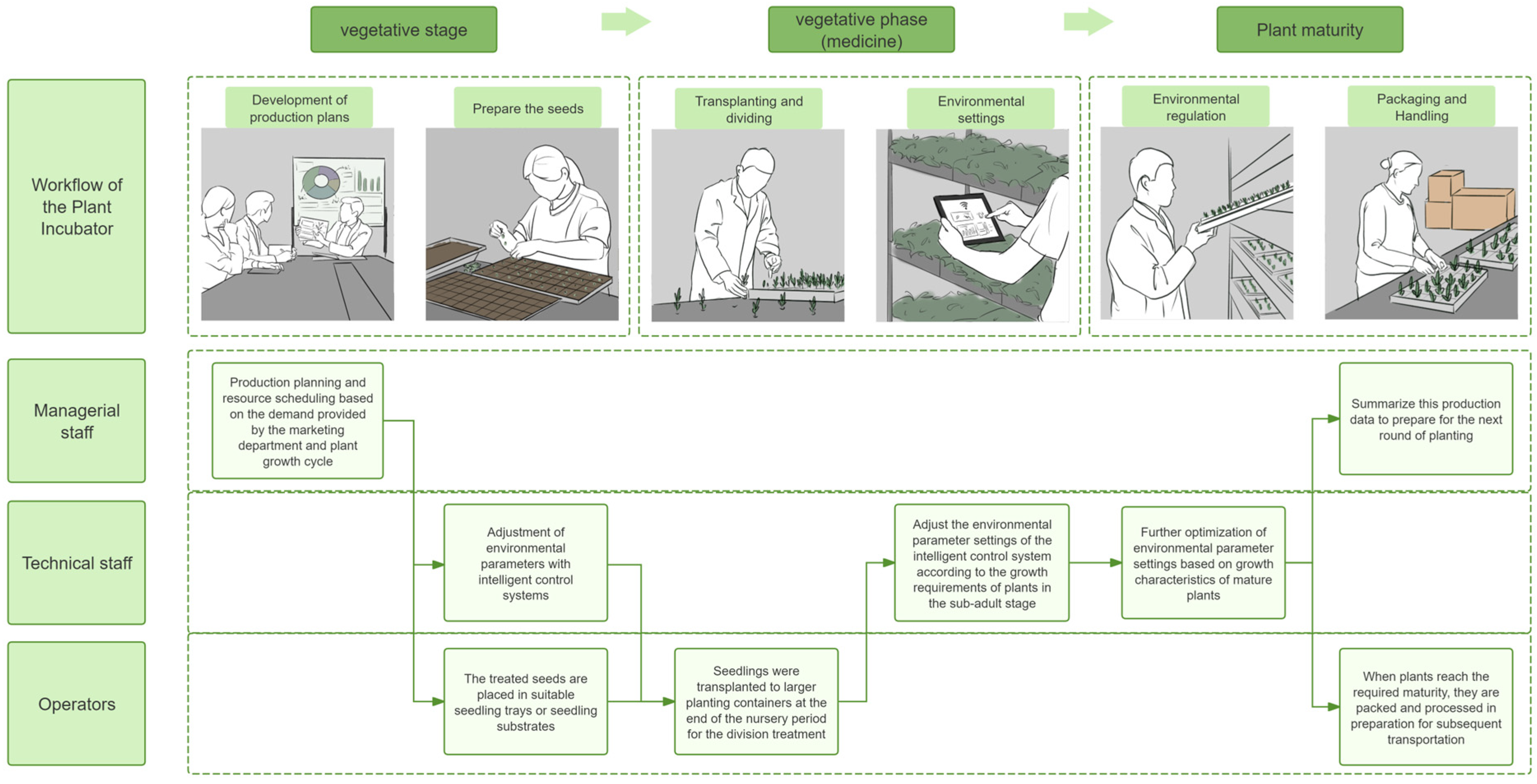 The plant growth cycle can be divided into seedling, sub-adult and mature stages. This research uses this time frame to define the workflow and operational flow of the intelligent plant cultivation base. In each growth stage, the core of the base is to provide the best environment for plants. In terms of workflow, the users of the plant cultivation base can be divided into three categories: managers coordinate the planning and formulate planting plans; technicians operate and maintain the cultivation system to accurately control and optimize the environment; operators are the frontline production executives who undertake daily cultivation work such as sowing, transplanting, packaging, and so on, and although some of the work is reduced with the enhancement of automation, some parts still require manual intervention. The interaction between the staff and the product mainly includes controlling environmental parameters, system operation, plant division, planting, handling, packaging, and equipment maintenance and repair (