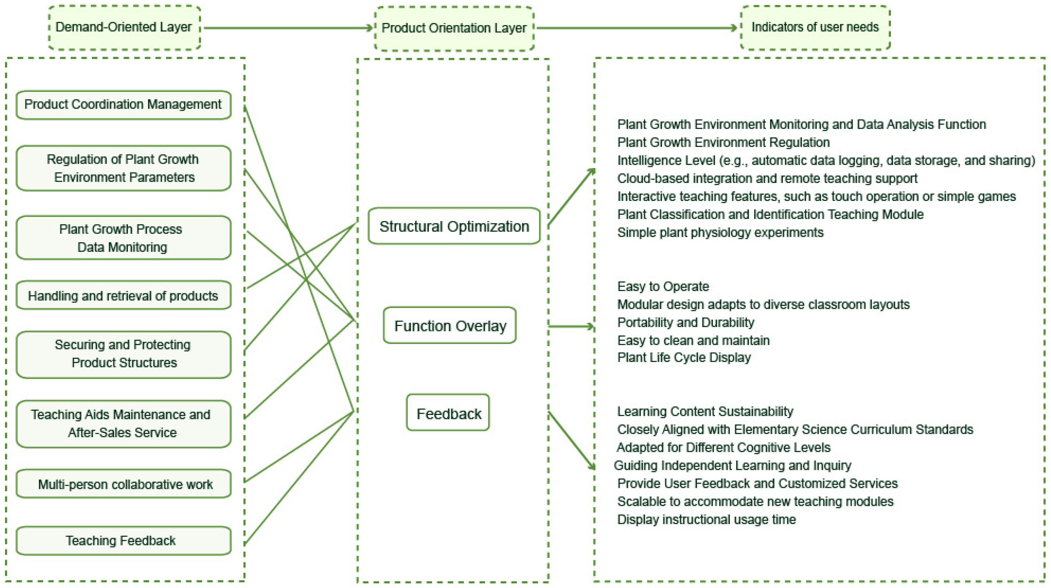 Applying the Kano model to identify users’ needs for plant growth cycle science teaching aids and organizing these needs through quantitative data analysis can provide solid data support for the subsequent design strategy of teaching aid products. This study prioritized and numbered the demand indicators to facilitate accurate positioning and quick retrieval in the subsequent design of the Likert-type satisfaction scale questionnaire. Meanwhile, to build a hierarchical analysis framework, this study summarized and classified the demand indicators into three levels: product function superposition, product structure optimization, and product information feedback (