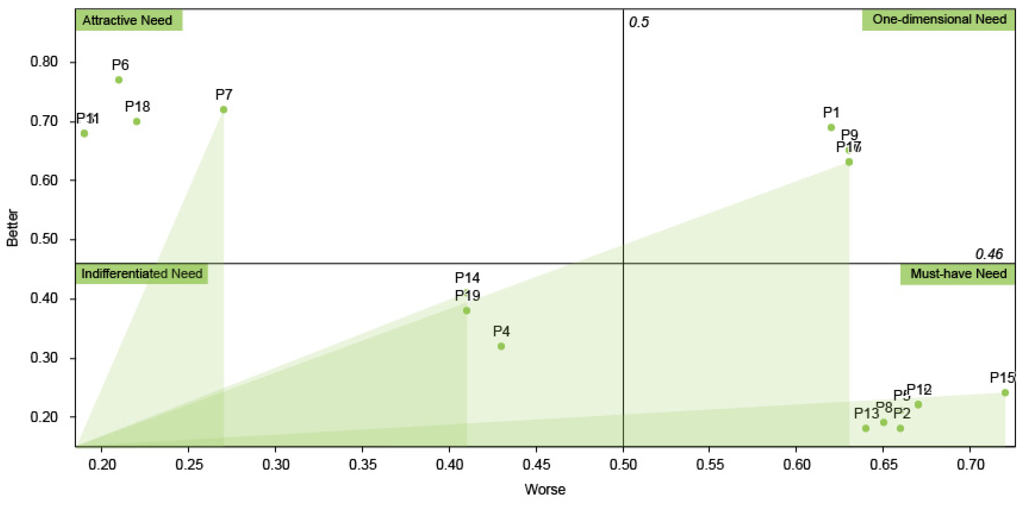 The survey results were categorized using the KANO model’s two-dimensional attribute classification evaluation table (