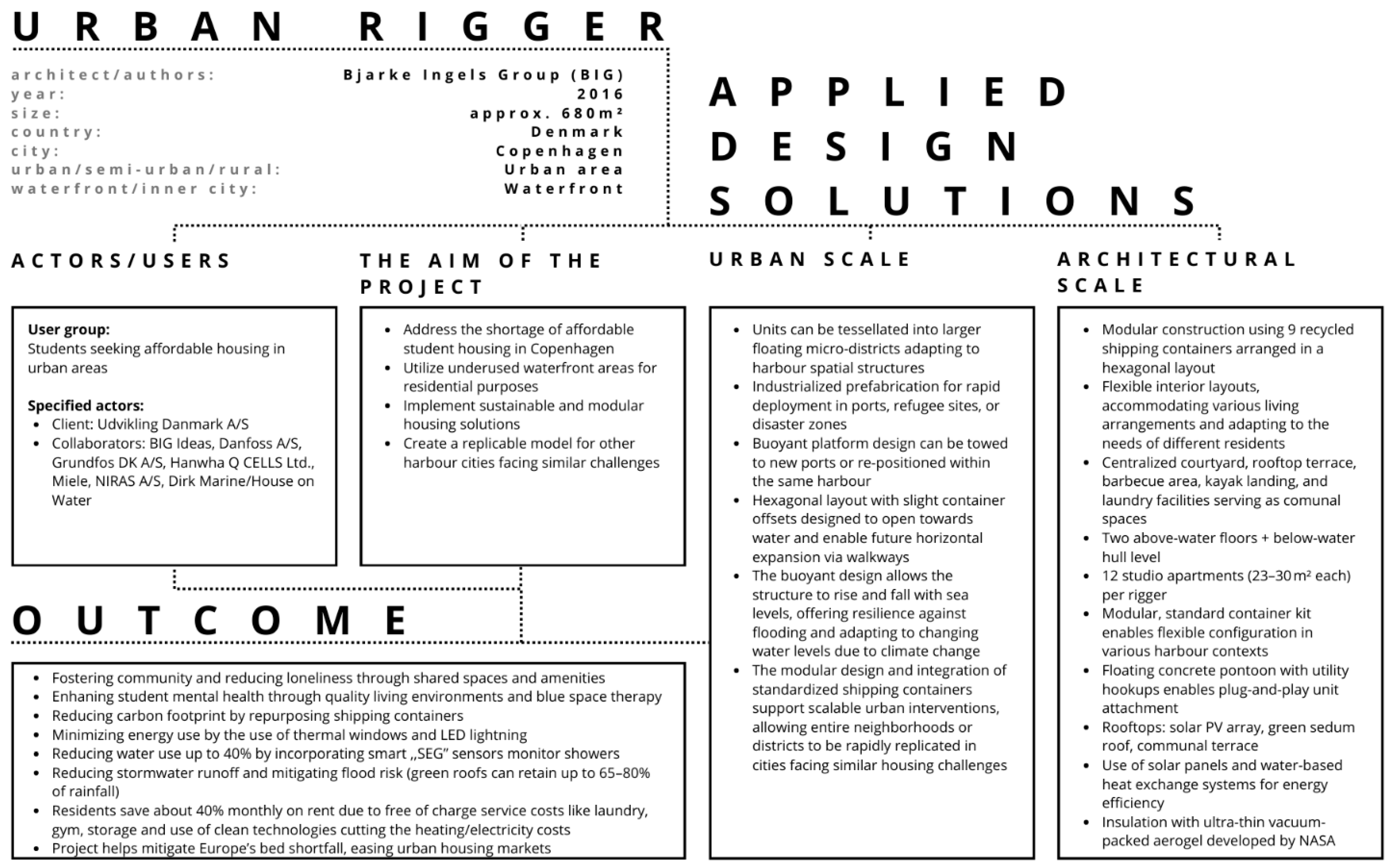 - Urban Rigger (Copenhagen, Denmark): A floating modular housing solution designed to address urban density and flood risk through sustainable, scalable architecture.