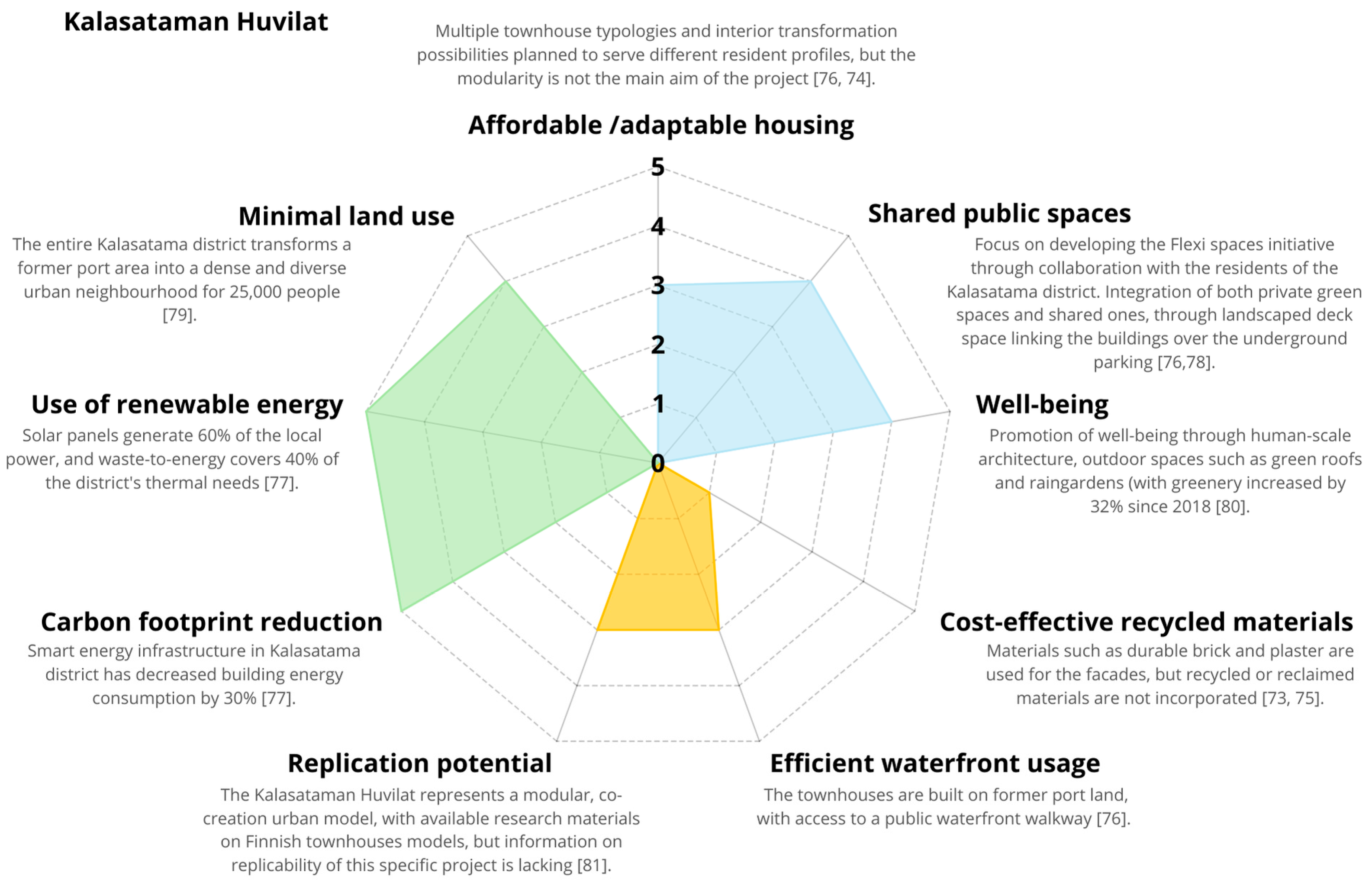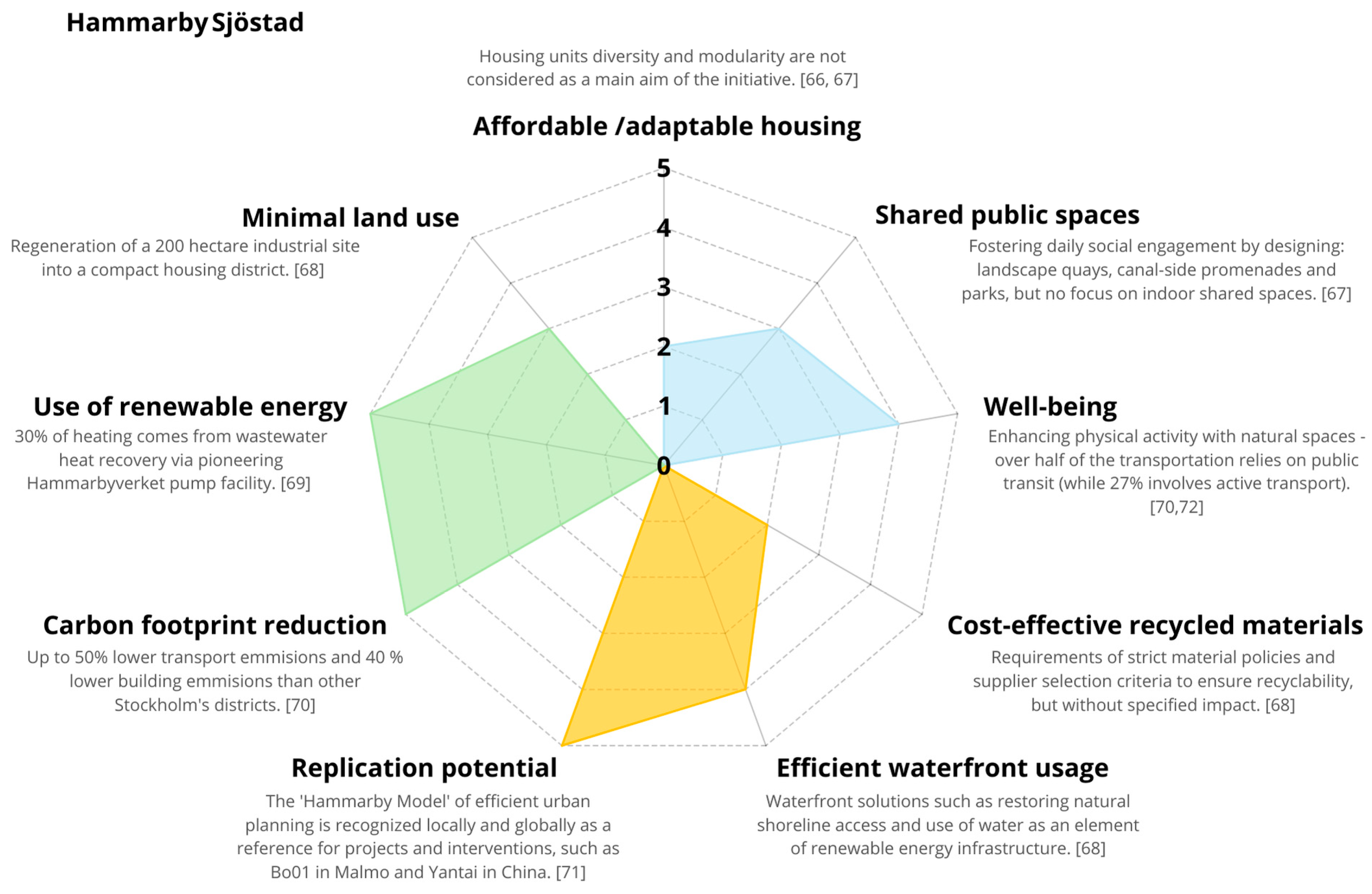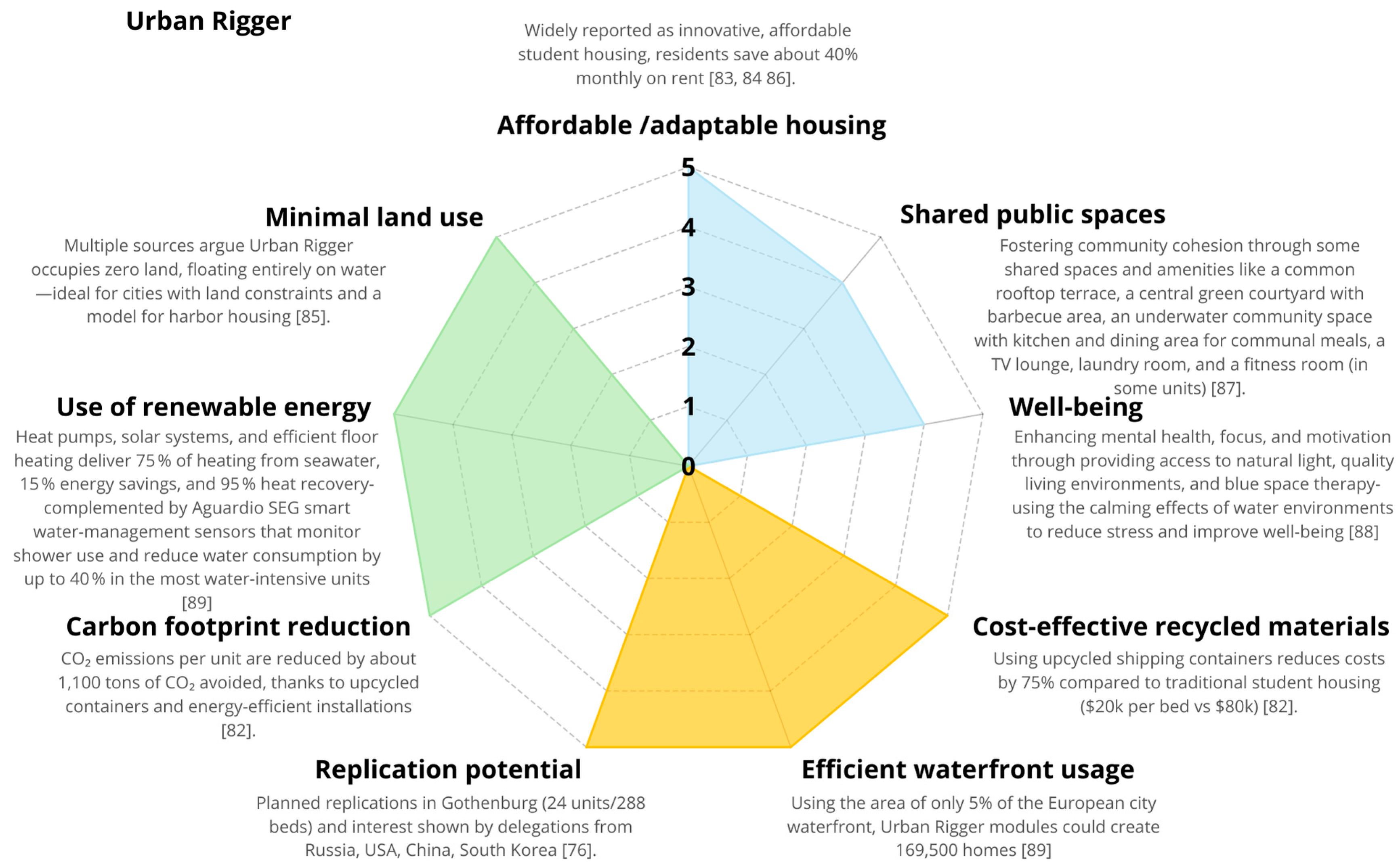 - In the environmental dimension, Hammarby Sjöstad and Kalasataman Huvilat both achieved 5/5 for carbon footprint reduction and renewable energy integration, while Urban Rigger scored 4/5 and 5/5, respectively, with an additional 5/5 for land-use efficiency.