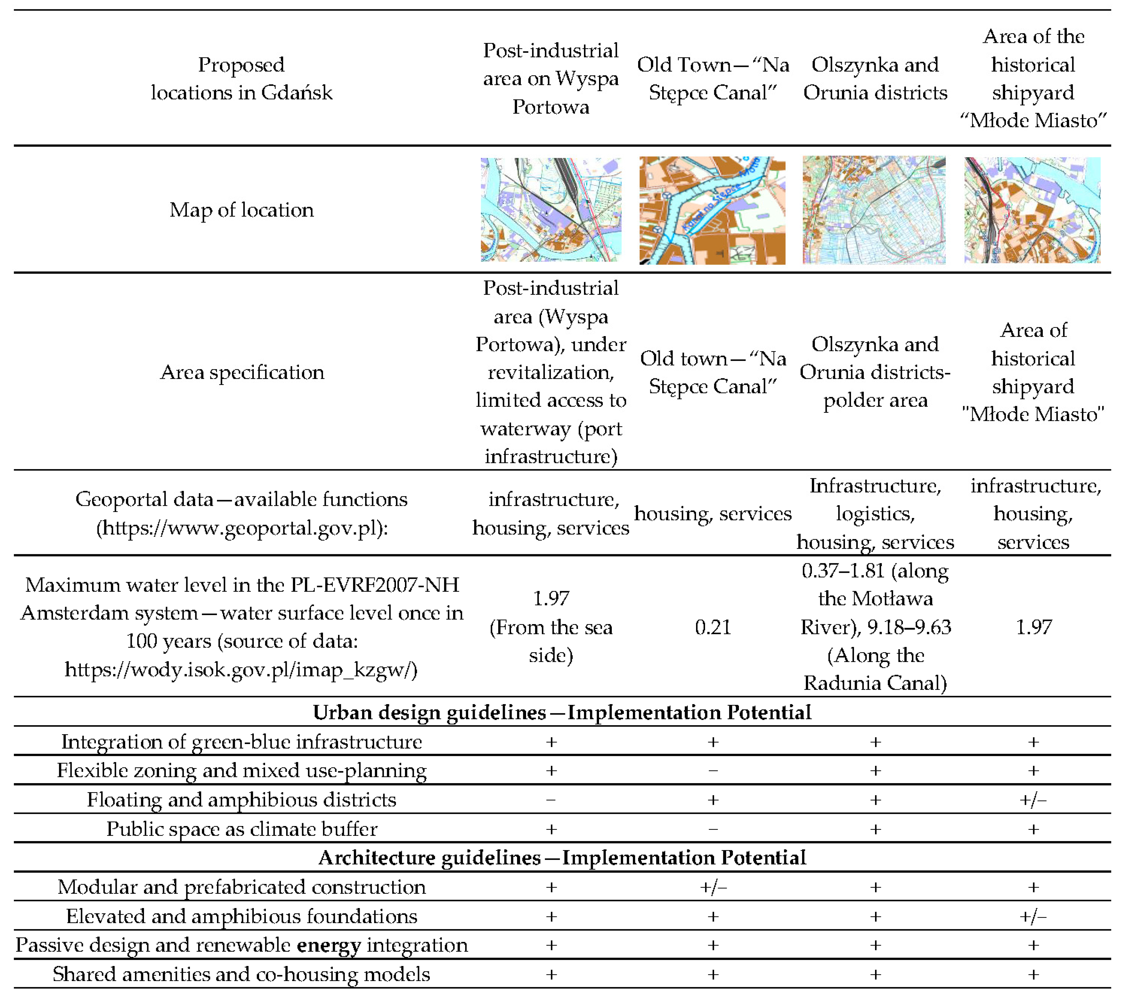 - Post-industrial area on Wyspa Portowa: A zone currently undergoing revitalization, shaped by the legacy of industrial functions. Its limited accessibility to waterways, due to the dominance of port infrastructure, poses challenges for integration with public waterfront spaces (but no possibility of amphibious housing due to the importance of port waterway connection), yet it offers opportunities for adaptive reuse of industrial landscapes.