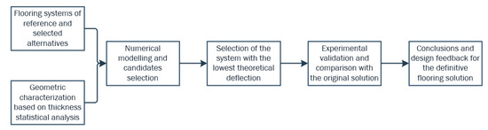 This study combines numerical modeling and full-scale testing to evaluate the structural behavior of TSPA girders, using a new construction process designed to prevent rigid-body displacements. The approach, based on rigorous statistical analysis followed by experimental validation, seeks to identify an efficient design candidate from numerical simulations to address the excessive deflections observed in the original CES flooring system. The research methodology consisted of the steps presented in Figure 2.