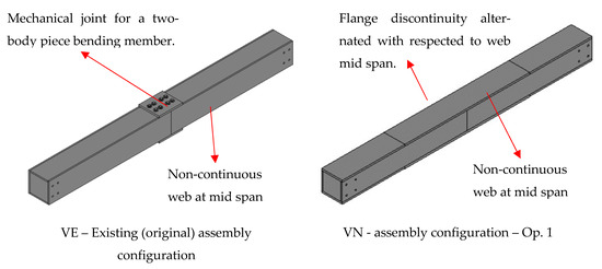 Seven full-scale specimens were fabricated using Assembly Option 1 (see Table 2), which enabled the construction of a TSPA girder without mechanical overlapping plates (see Figure 3). The specimens were tested under service load conditions to measure midspan deflections and compare the results with those obtained from the numerical simulations. These specimens were designated with the testing code VN.