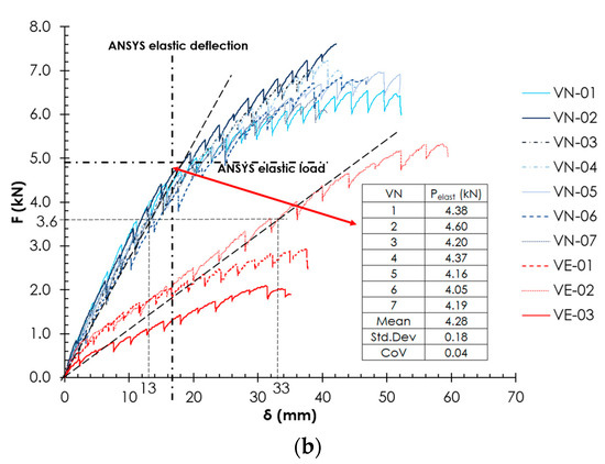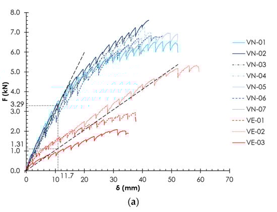 Testing seven specimens with the new assembly configuration (VN) and three girders with the original configuration (VE) enabled a detailed analysis of mechanical response through load–displacement diagrams (Figure 9). Despite the limited number of VE girders tested in the elastic range, the VN assembly demonstrated a 287% increase in bending capacity (Figure 10a) and a 61% improvement in deflection performance (Figure 10b).