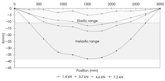 Figure 11 shows the deflection response of girder VN-02 at selected points as the load increased. The elastic limit, defined as the allowable deflection of L/78 according to previous research [22], is also indicated. Results suggest that a TSPA girder can sustain up to 4.5 times its elastic limit deflection before collapse. The same procedure was applied to all other VN and VE girders.