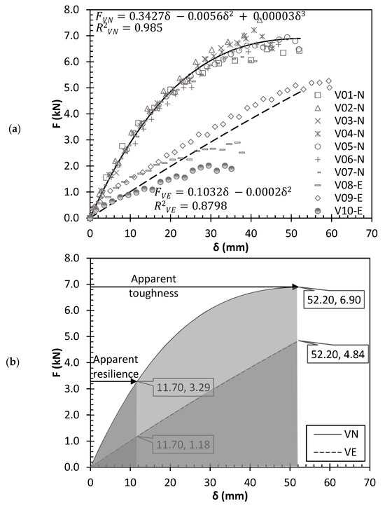 Least squares mathematical models for the mechanical response of applied load vs. midspan deflection: (a) for each VN and VE girder assembly test; (b) schematic average resilience capacity and apparent toughness with their integration limits for the VN and VE girder assemblies tested (kN·mm).