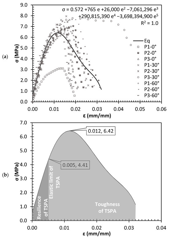 A data fit was previously performed using the least squares method (LSM) on 600 data points from 15 tension tests, adapting the ASTM E8 standard as reported by Fuentes [20], to obtain the first approximated stress–strain curve for TSPA. The fitted curve is presented in Figure 13a. Similarly, Figure 13b illustrates the resilience and toughness of TSPA within the context of the stress–strain curve, directly reflecting the mechanical response of the material as detailed by Fuentes [20].