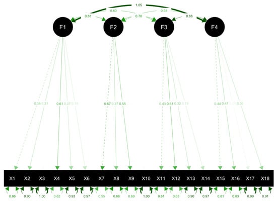 To complement the Confirmatory Factor Analysis (CFA), additional measures of convergent reliability were computed following [58]. Standardized factor loadings () and error variances () were obtained directly from the CFA model (Figure 2). The explained variance for each item was computed as . Table 3 presents the standardized loadings, error variances, and explained variance () for all items.