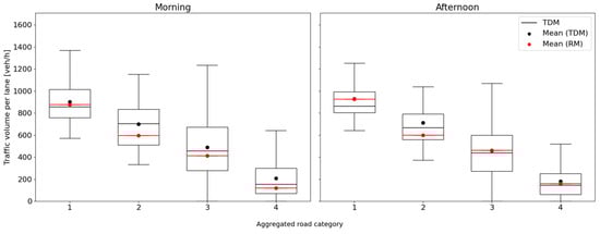 The analysis of results for the morning and afternoon peak traffic conditions indicates that the mean traffic volume estimated by the RM for each aggregated road category falls within the interquartile range (between the first and third quartiles) of the TDM data. It is also noticeable that the mean traffic volume for the RM model for the morning peak traffic conditions is for any road category lower than the value for the TDM model. The differences are in the range of 22–108 veh./h. The largest difference in mean traffic volume occurs for the second road category.