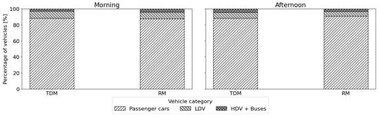 The data presented in Figure 5 indicate that differences in the averaged percentage shares of vehicle categories estimated by the two models during the morning peak for passenger cars and light commercial vehicles do not exceed 1%, with the RM slightly underestimating the shares. In contrast, for the combined truck and bus category, the RM estimates a higher share of 4%, compared to 2.9% in the TDM. Slightly larger differences between the two models are observed for the afternoon peak conditions. In this case, the differences for the LDV and truck and bus categories are similar, with the RM indicating lower shares, while for passenger cars, the TDM shows a 1.5% lower share.