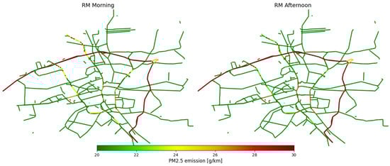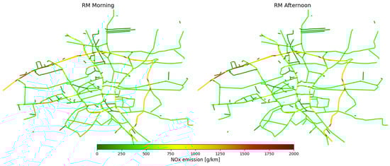 Figure 6 and Figure 7 illustrate the distribution of PM2.5 and NOx emissions, respectively, in the Bielsko-Biała road network, obtained with the RM data for the morning and afternoon peak hours.