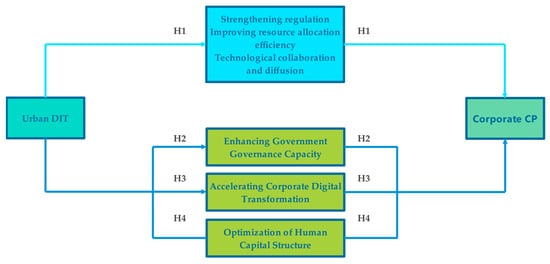 Urban DIT significantly enhances firms’ GI capabilities by promoting corporate digital transformation. Against the backdrop of continuously improving digital infrastructure and strengthening policy guidance at the city level, firms are increasingly able to adopt advanced technologies such as big data, artificial intelligence, and the Internet of Things. These technologies enable firms to restructure production processes and management systems, fostering the development of data-driven operational models. This transformation allows firms to monitor energy consumption and emissions in real time and implement precise control measures, thereby providing essential technological support for GI [44]. According to the Resource-Based View (RBV), the digital assets, intelligent systems, and data analytics capabilities accumulated through digital transformation constitute strategic resources that are difficult for competitors to imitate. These resources help firms identify viable technological pathways for energy conservation and emission reduction, while reducing the trial-and-error costs associated with green R&D. Furthermore, the Dynamic Capabilities Theory suggests that firms must possess the ability to sense environmental changes, integrate resources, and reconfigure internal processes to respond to complex challenges. The digital environment enhances firms’ responsiveness to policy signals and market demands, enabling them to swiftly identify opportunities in green technologies [45]. Through digital R&D platforms, firms can achieve cross-functional collaboration and accelerate the iteration of green products. At the same time, digital systems facilitate knowledge creation and sharing. Firms continuously refine their production processes based on data feedback, fostering organizational learning and strengthening the internal drivers of GI. Therefore, we propose: