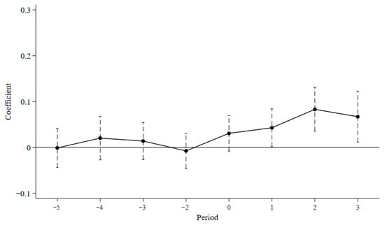 In the model, denotes a set of time dummy variables indicating the z year relative to the implementation of NAIPZ, where z = −11, −10, −9, −8, −7, −6, −5, −4, −3, −2, −1, 0, 1, 2, 3. All other variables are consistent with Model (1). To address potential multicollinearity, the period immediately before the policy takes effect (z = −1) is set as the base category. Periods prior to z = −5 are collapsed into a single category (z ≤ −5). The coefficients of interest, denoted by , capture the interaction between the and . If the coefficients are statistically insignificant when z ≤ 0, this supports the parallel trends assumption. As shown in Figure 2, for z ≤ 0, the interaction terms between and are not statistically significant, and the confidence intervals include zero. In contrast, for z > 0, these coefficients become positive and statistically significant, indicating a clear divergence after policy adoption. Therefore, the parallel trends assumption is satisfied. This finding confirms that urban DIT serves as a valid identification strategy and strengthens the robustness of the baseline regression results.