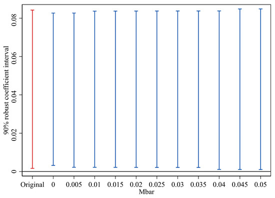 To assess the robustness of the parallel trends test, this study follows the approach of Rambachan and Roth (2023) [52] and employs the Honest Difference-in-Differences (Honest DID) method to evaluate sensitivity to potential violations of parallel trends. Furthermore, following Biasi and Sarsons (2022) [53], we set the maximum deviation level Mbar = 1 × 0.005. Under this assumption, we examine whether the post-policy coefficients deviate from the pre-policy trend that is projected to continue under this maximum plausible deviation. As shown in Figure 3, under the specified maximum deviation level, the estimated coefficient for the first year of policy implementation remains statistically significant even at the upper bound of deviation. This indicates that the estimated treatment effect is robust even if the parallel trends assumption is subject to plausible violations, thereby reinforcing the credibility of our baseline findings. The sensitivity analysis results for the second and third periods are reported in the Supplementary Materials.