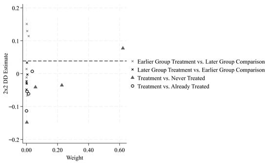 In staggered Difference-in-Differences (DID) designs, treatment is not implemented simultaneously across all units. Because different units receive the policy intervention at different times. This leads to the so-called “bad control” problem (Goodman-Bacon, 2021) [54]. To examine this issue, we apply the Goodman–Bacon decomposition method. This approach breaks down the overall DID estimator into all possible 2 × 2 DID estimates based on pairwise comparisons between treatment and control groups. (Detailed decomposition results are presented in Supplementary Materials Section S5) Each pairwise estimate is weighted according to its contribution to the full-sample result. As shown in Figure 4, the share of later group treatment vs. earlier group comparison is small. This indicates that the estimated effect of urban DIT on corporate GI is unlikely to be driven by the bad control problem. A closer look at the decomposition reveals that 90.9% of the total weight comes from comparisons in which never-treated units serve as the control group. In contrast, comparisons that use already-treated units as controls—those potentially affected by the bad control problem—account for only 5.4% of the total weight. Therefore, the staggered DID estimator used in this study is robust and credible.