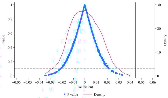 To mitigate potential biases arising from unobserved omitted variables in the baseline regression, we conduct a placebo test. Specifically, we randomly assign pseudo-policy groups in the sample, generating fake treatment dummies. We construct a placebo test by randomly selecting a group of firms—equal in number to the actual treatment group—as a pseudo-treatment group, with the remaining firms treated as the control group. This simulation is repeated 500 times. As shown in Figure 5, the results of the placebo test indicate that the distribution of estimated coefficients is approximately normal, centered around zero, and notably distinct from the true coefficient. Moreover, the randomly generated coefficients predominantly fall to the left of the actual coefficient value of 0.045, with significant differences observed at the 1% significance level compared to the simulated random process. These findings collectively suggest that unobserved factors have not influenced the empirical results reported in this study.