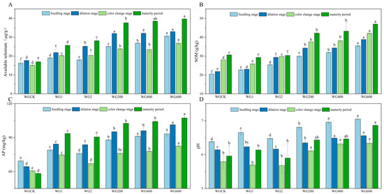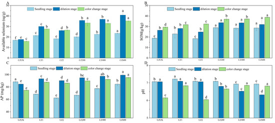 Dynamics of soil available selenium, SOM, AP, and pH in ‘Bing Tang Cheng’ under different treatments. (A): Soil available selenium content across treatments in ‘Bing Tang Cheng’; (B): SOM content across treatments; (C): AP content across treatments; (D): soil pH values across treatments. Lowercase letters indicate statistically significant differences among treatments at the p < 0.05 level.